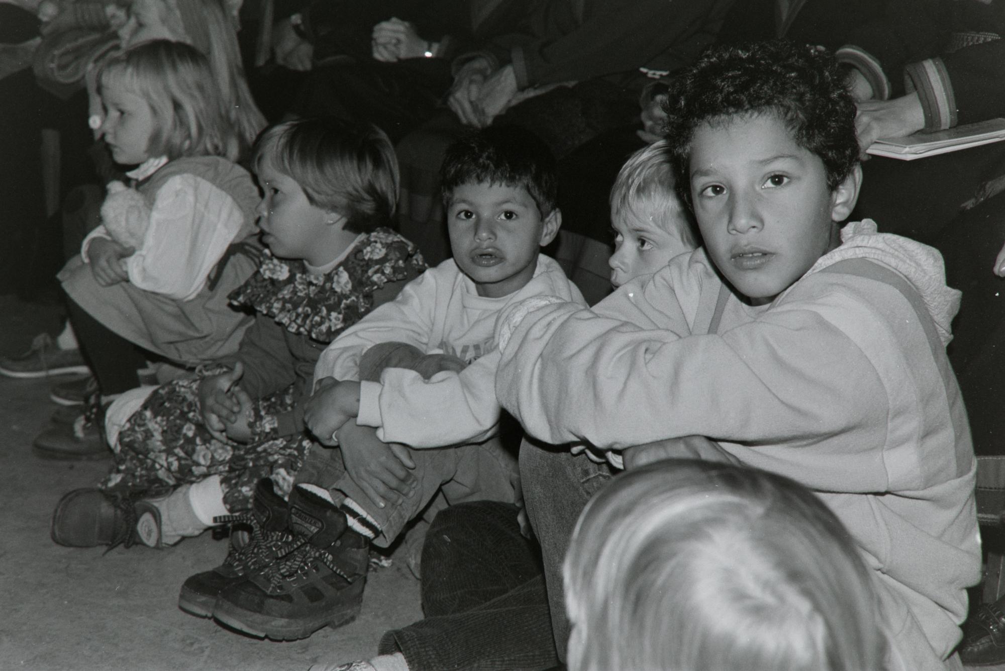 • Barn sitter i en publik av vuxna under invigning av Jämtlands länsmuseums samiska avdelning. Samefolket nr. 10 1992.