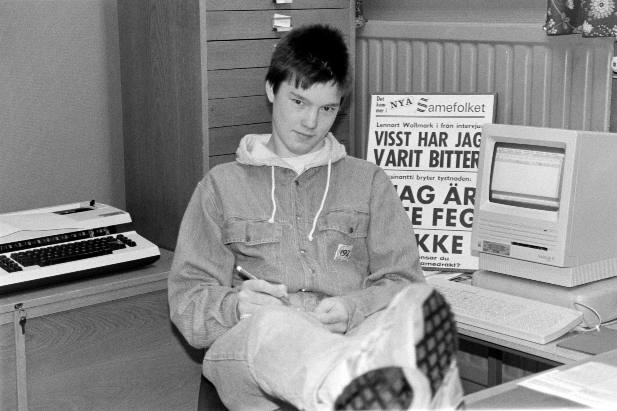 En yngre man sitter på en stol med fötterna uppe på bordet framför sig, en penna i handen. Bredvid honom står en gammal, klumpig dator som är påslagen och visar Windows Paint på skärmen. Bakom honom hänger en plansch med texten: "Det kommer i NYA Samefolket, Lennart Wallmark från intervju: VISST HAR JAG VARIT BITTER...". Samefolket nr 3, 1992.