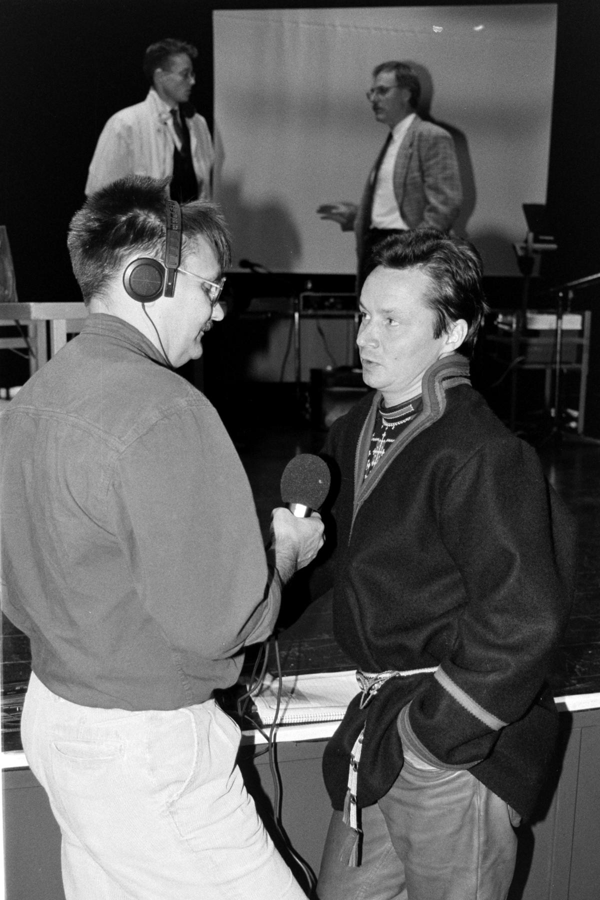 • En man med hörlurar håller i en mikrofon och intervjuar en man klädd i sydsamisk kolt bredvid en scen. Lite längre bort på scenen står två män och samtalar. Scenen är utrustad med olika mikrofoner och annan teknisk utrustning, och en filmduk hänger från taket i bakgrunden.