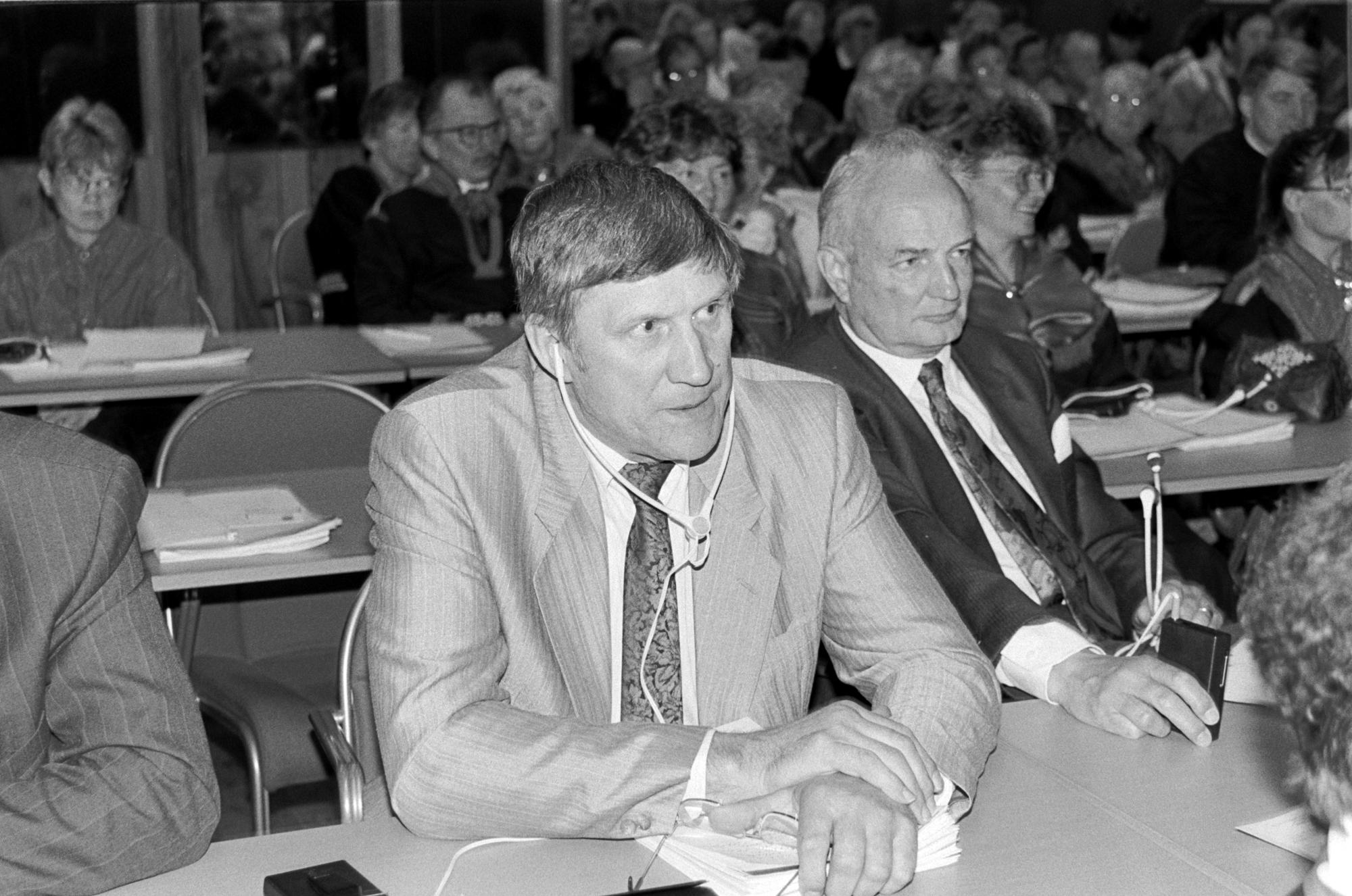 I förgrunden sitter flera män i kostym och slips. Mannen närmast kameran har hörlurar på sig och verkar möjligtvis lyssna på översättningar av det som sägs. Bakom honom syns många personer, både män och kvinnor, varav några bär kolt. Stämningen är formell och mötesdeltagarna verkar engagerade.