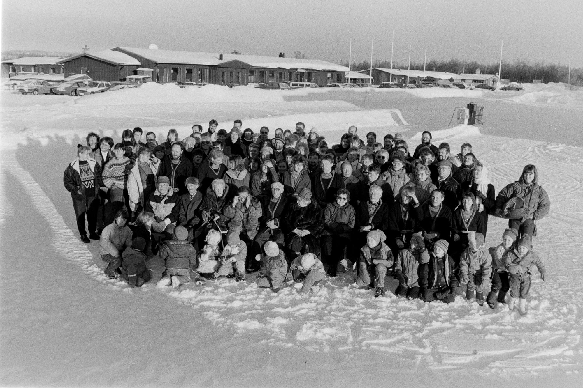 • Gruppbild av människor som deltog på det stora sydsamiska mötet i Vauldalen på den norska sidan av Saepmie (saS). Samefolket nr.2 1990.