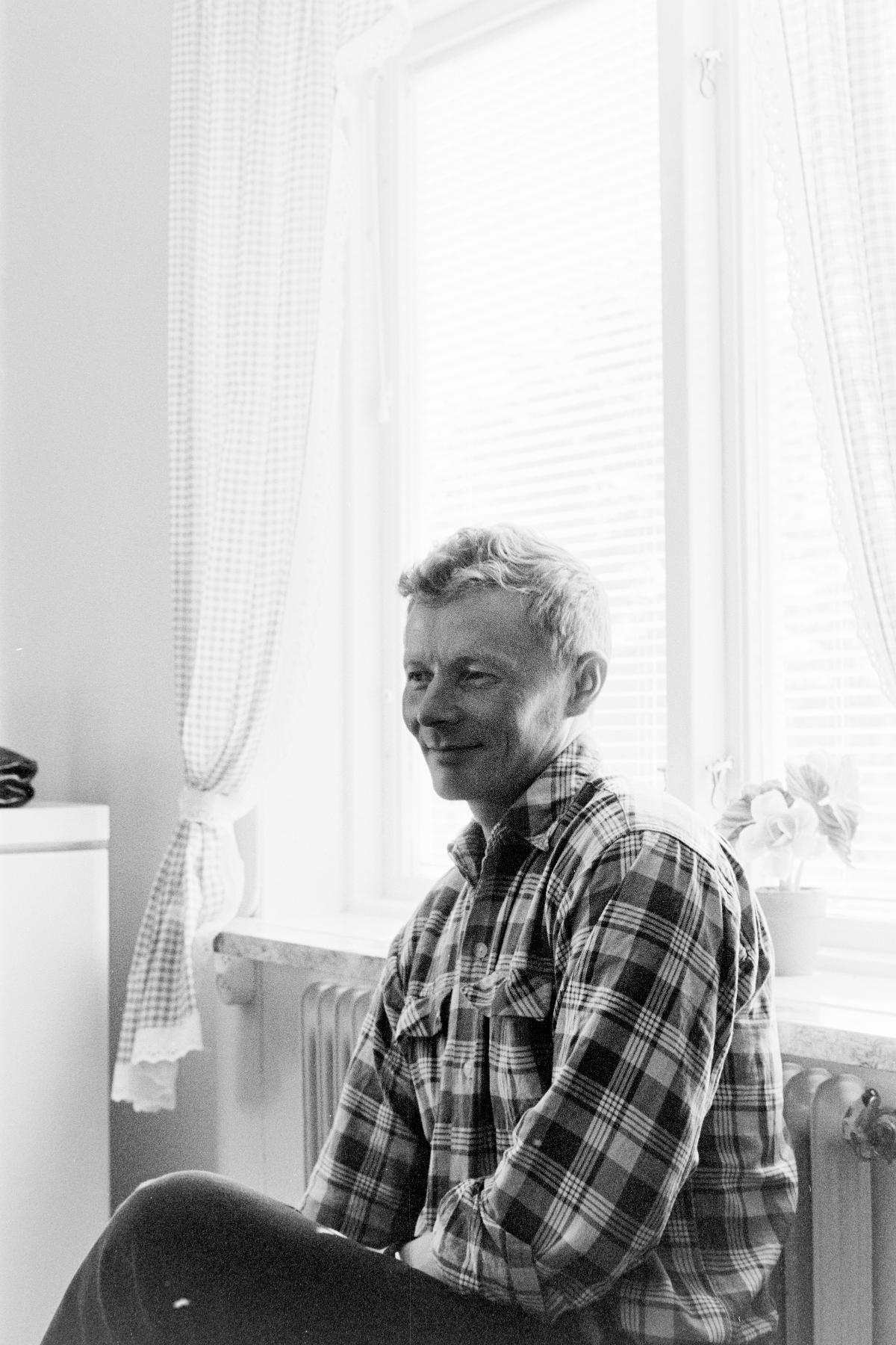 • En leende man i rutig skjorta sitter vid ett fönster.