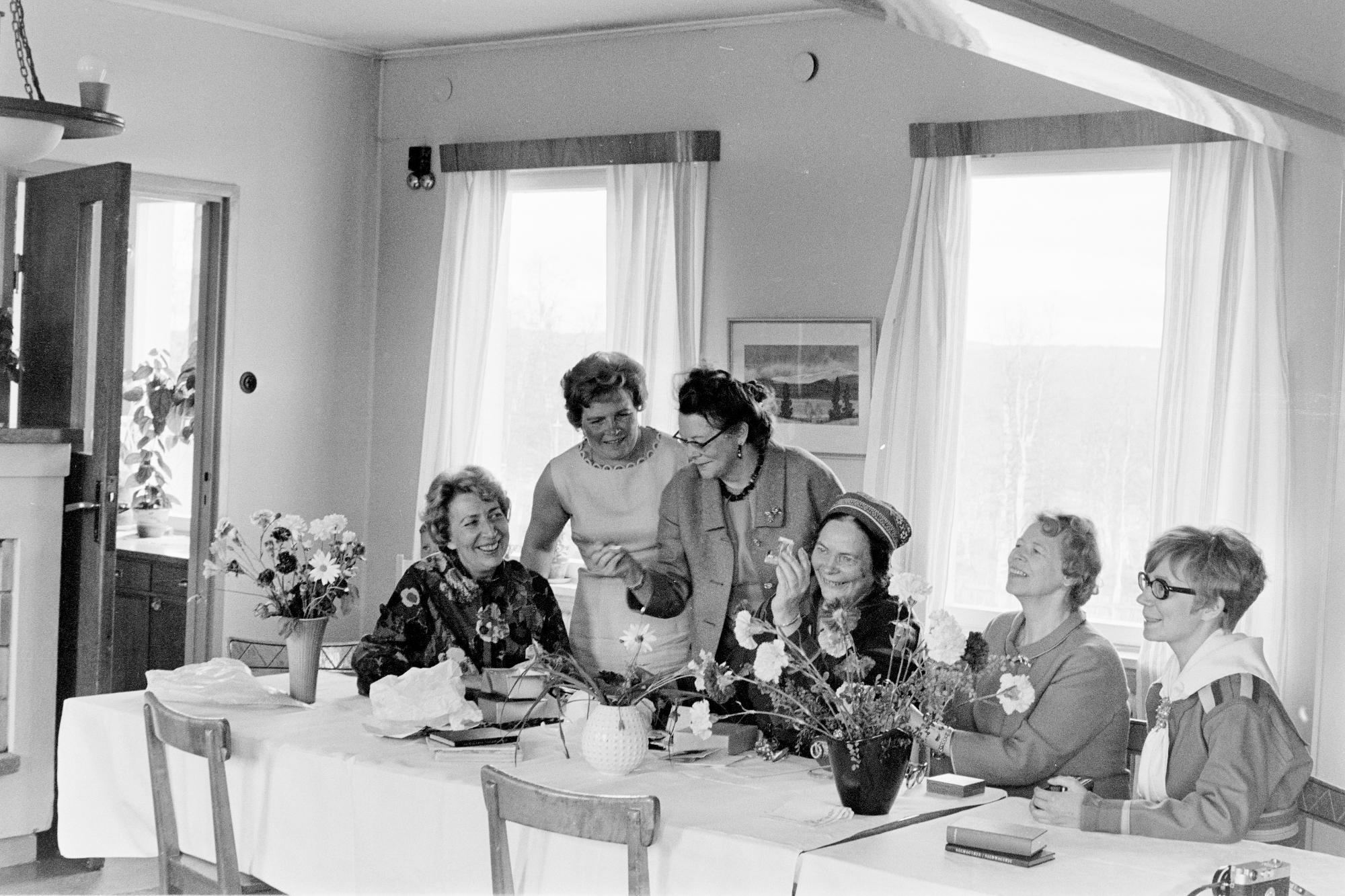 • Kalas, fika, med kvinnor på bord där det står blommor i vaser.
