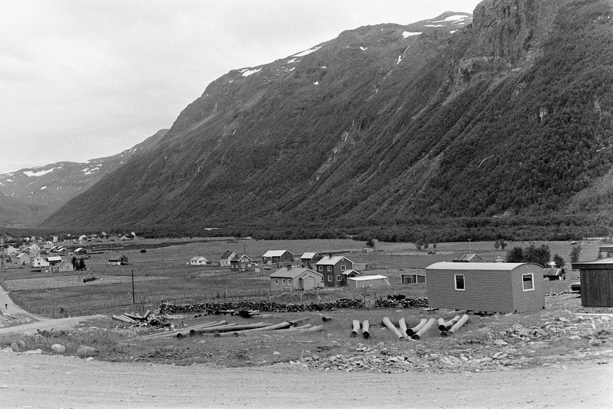 • En gruvsväg med hagar och bosättningar med många hus och uthus omgivna av odlingsmarker. I bakgrunden tronar höga fjäll.