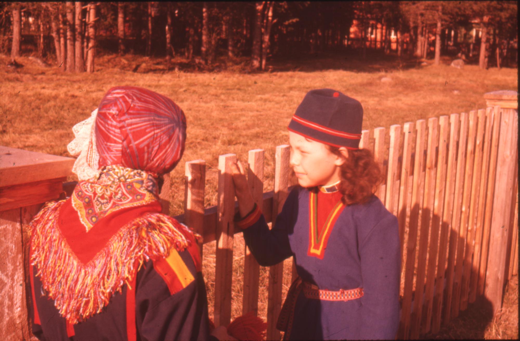 Två flickor står framför ett trästaket. Båda bär kolt. Den ena flickan har kolt från Karesuando den andra kolt från lulesamiskt område. Bakom staketet finns en gräsmatta och en skogsdunge.