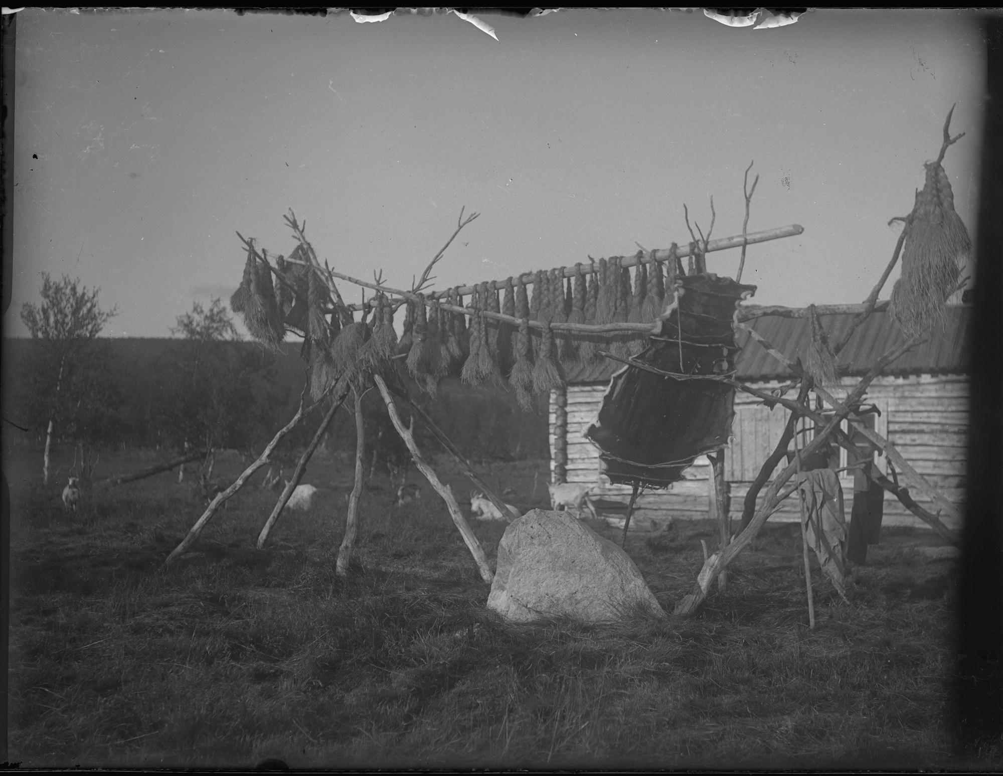 • Förrådsställning av klykstänger, i ställningen hänger skohöflätor, bilgá (saN). Lutat mot ställningen ett uppspänt renskinn. I bakgrunden står en timrad stuga med plåttak. I bakgrunden syns några getter.