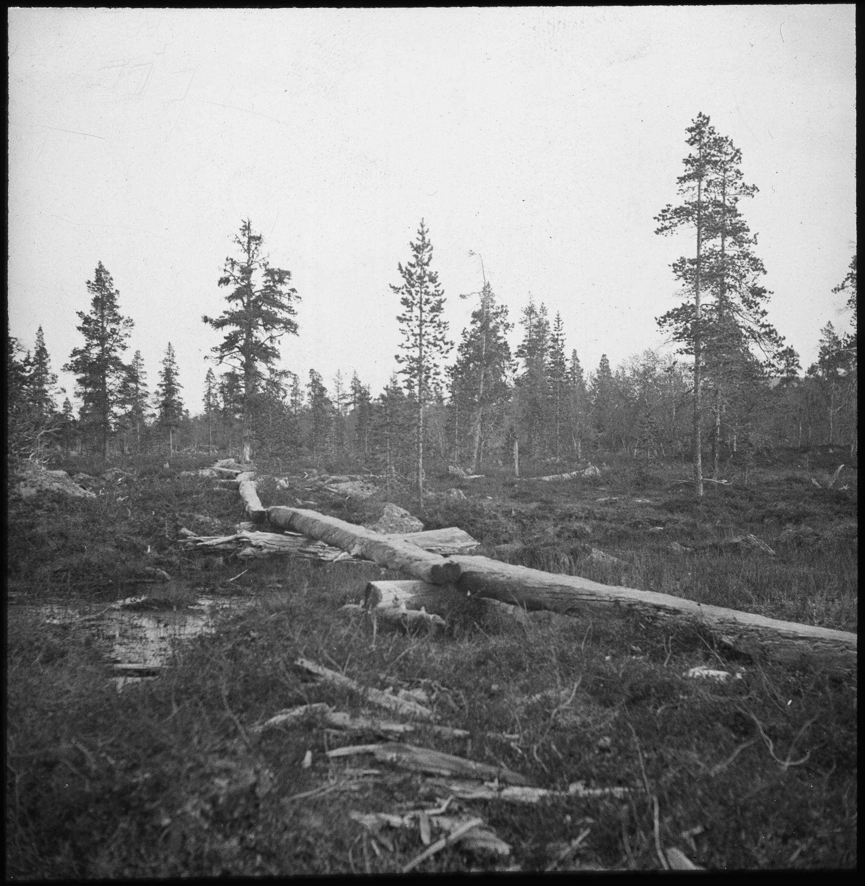 • En spång av en grov trädstam leder över en myr i skogslandet.