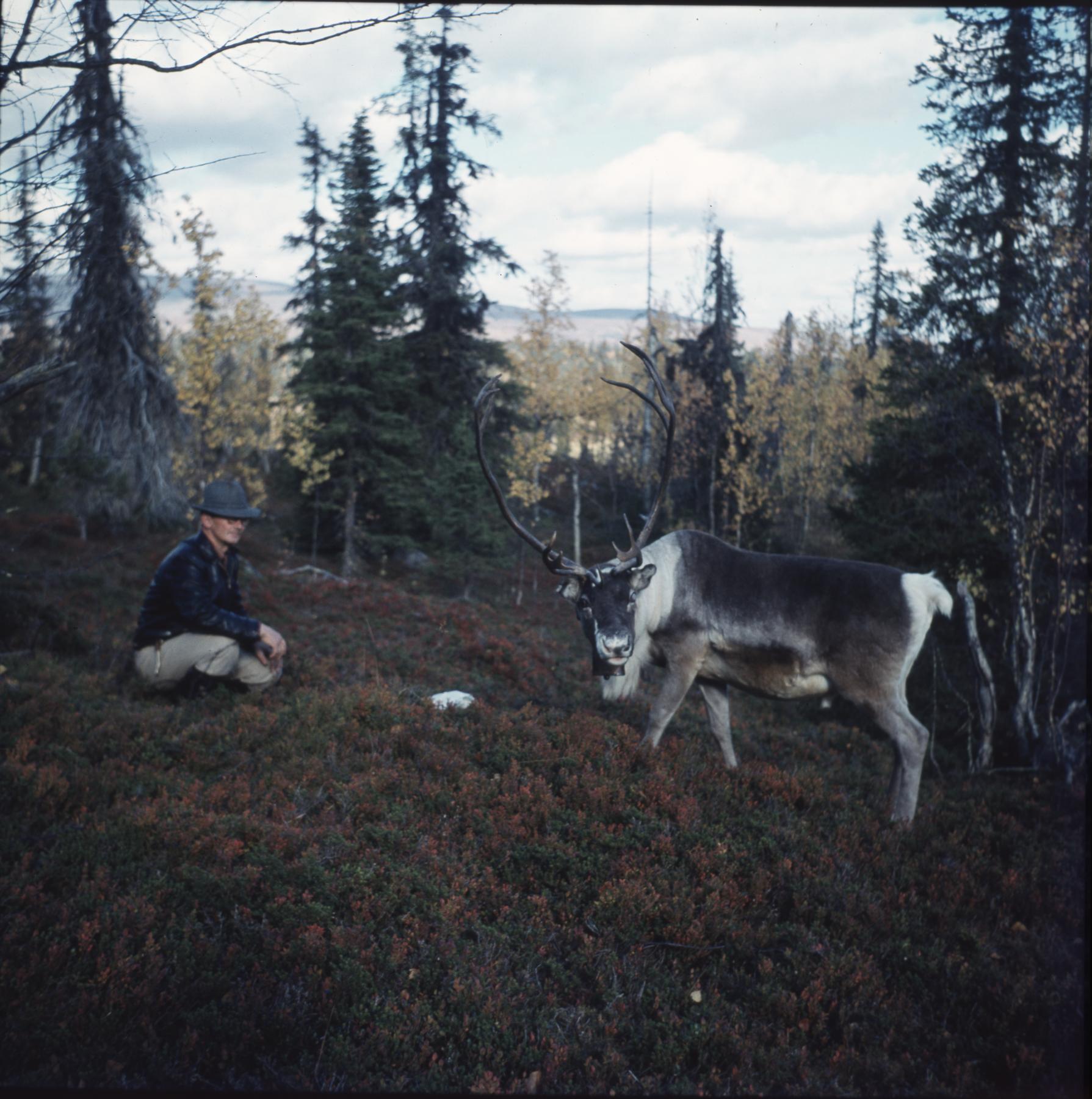 • en man klädd i hatt sitter på huk i skogen med en rentjur bredvid sig.