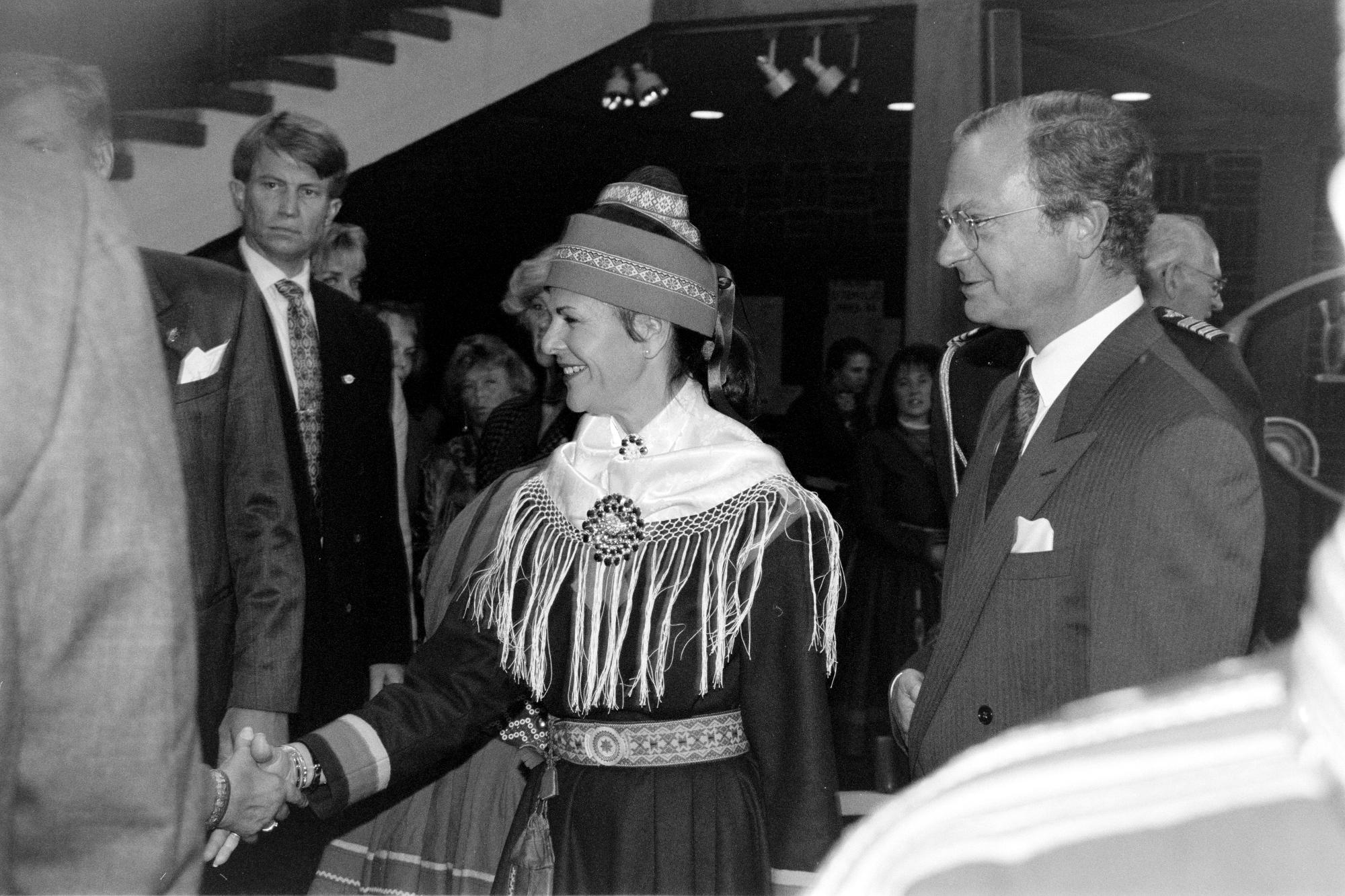 • Silvia, drottning av Sverige tillsammans med Carl XVI Gustaf, kung av Sverige, bland deltagare på Sametingets invigning den 25 augusti 1993. Samefolket nr. 9 1993.