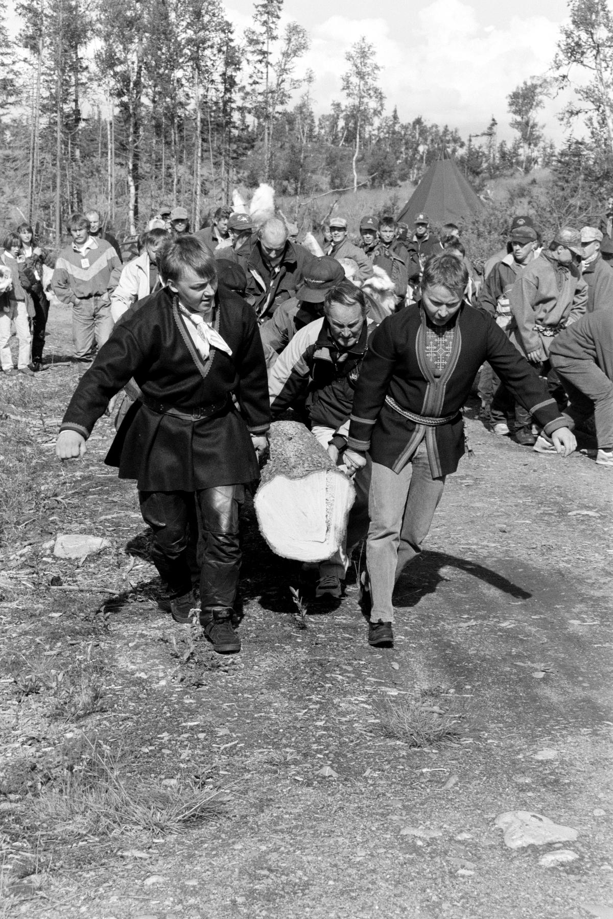 Män i kolt bär stock till blockad. Simultan samisk vägblockad med fastkedjade aktivister på E14 vid Storlien och på E12 vid Tärnaby i protest mot den fria småviltsjakten. En reform beslutad av regeringen Bildt, som Girjasdomen i januari 2021 visade vara felaktig. Samefolkets chefredaktör Olle Andersson skildrar i text och bild en vredens, besvikelsens och de hårda ordens dag på E14. Tidningens Nora Wasara Larsson bevakade aktionen på E12:an, där Sven Mikaelsson fotograferade bland andra Ola Pittsa, som blev bortburen av polis. Se och läs följande bilder om hur en irriterad trafikant ville se samerna bortspolade från vägen, en annan att det borde bli fri jakt också på lapparna och en tredje bad samerna dra åt helvete. Aktionerna var ett tidigt exempel på fredlig civil olydnad, där aktivisterna lämnade passage för utryckningsfordon och där det fanns samer med uppgift att lugna ner situationen och berätta om skälen till varför de genomförde aktionerna. Samefolket nr.9 1994.