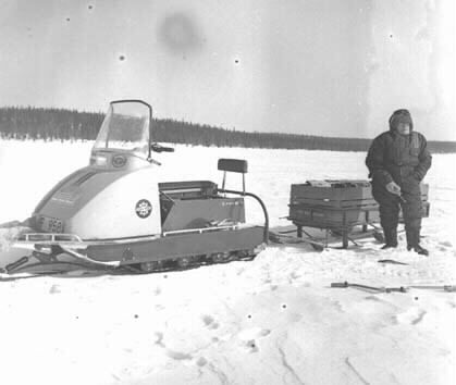 • Pimpelfiske på sjön Harrok, väster om Jokkmokk, 1977. Fiskaren har med sin skoter tagit sig ut på isen. Precis som fortfarande är fallet, pimpelfiske är populärt på de isbelagda sjöarna i norra Sverige under vårvintern.