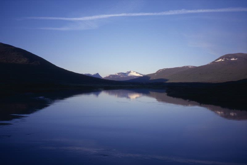 • Taget från bron över Miellädno mot Guohpervágge kl. 21.50 den 19 juli 1999. På väg tillbaka från Skuollávallda till Skämma.