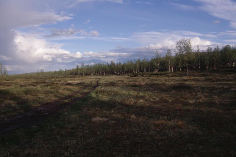 • En väg för fyrhjulingar 4 km söder om vistet i Tjåhke. Bilden visar en så kallad vada, en slätt där inga träd växer. På slätten växer gräs och renmossa, och runt omkring växer det träd.