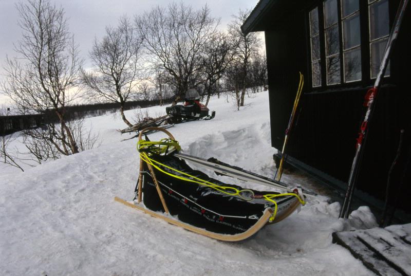 • Utrustning utanför stugan. Snöskoter med kälke för ripjägarna och pulkor för turisterna.