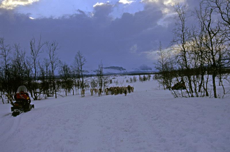 • Renhjorden är på väg från Sågats längs släkten Gruvvisares gamla flyttled mot Tsåhke, nära selet norr om Tjaktjavárátj