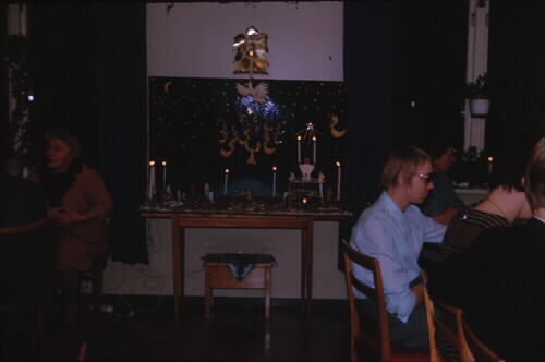 • julkrubba mitt i bilden med tända ljus, dukade bord runt om med folk