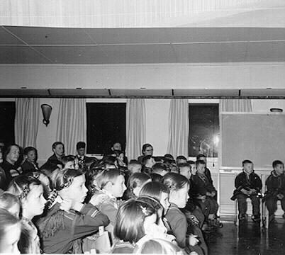 Samernas Folkhögskolas elever, vinterkursen 1955-1956. REDOGÖRELSE FÖR SAMERNAS FOLKHÖGSKOLA 1955-1956. Ur dagboken: Dec. 3 Elevafton. Nomadskolan inbjuden. Sagospel "Snövit", kaffe, lekar. Bild nummer 01234 - 01235, publiken i aulan