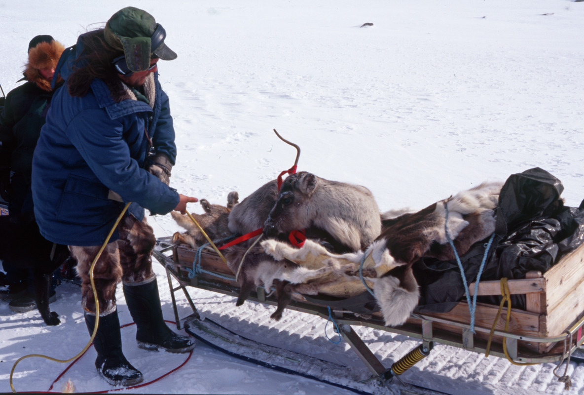 • Vårflytt med ren tillsammans med renskötare från Sör Kaitum. Renhjord på väg söder om Måskotjåkkå mot Tjourvek. Trött renkalv läggs på skoterkälke