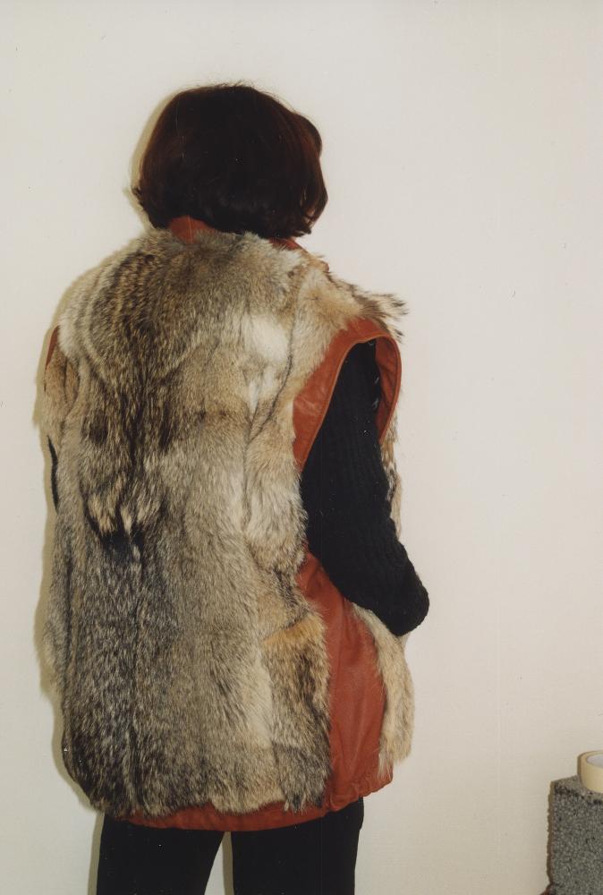 • Kvinna bärandes pälsväst, bilden är fotograferad snett bakifrån
