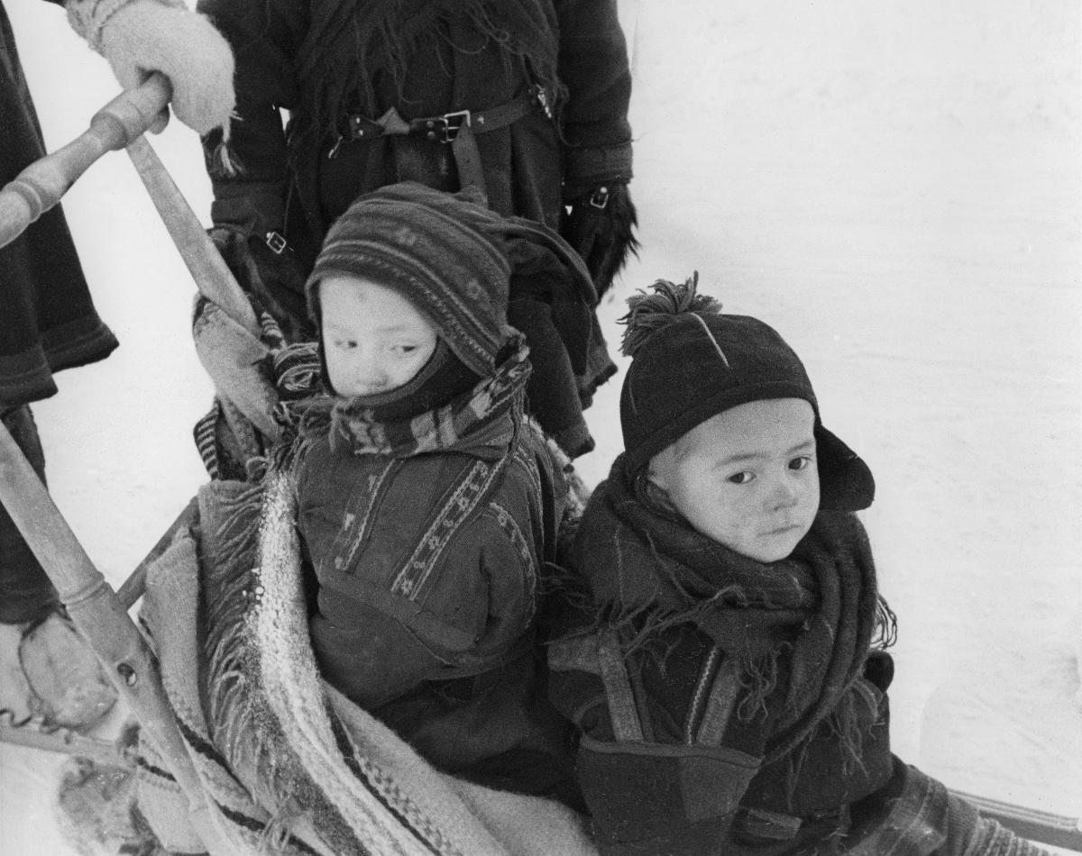 • Samiska barn följer händelseutvecklingen i Vaisaluokta med stort lugn. Vintern 1944/1945.