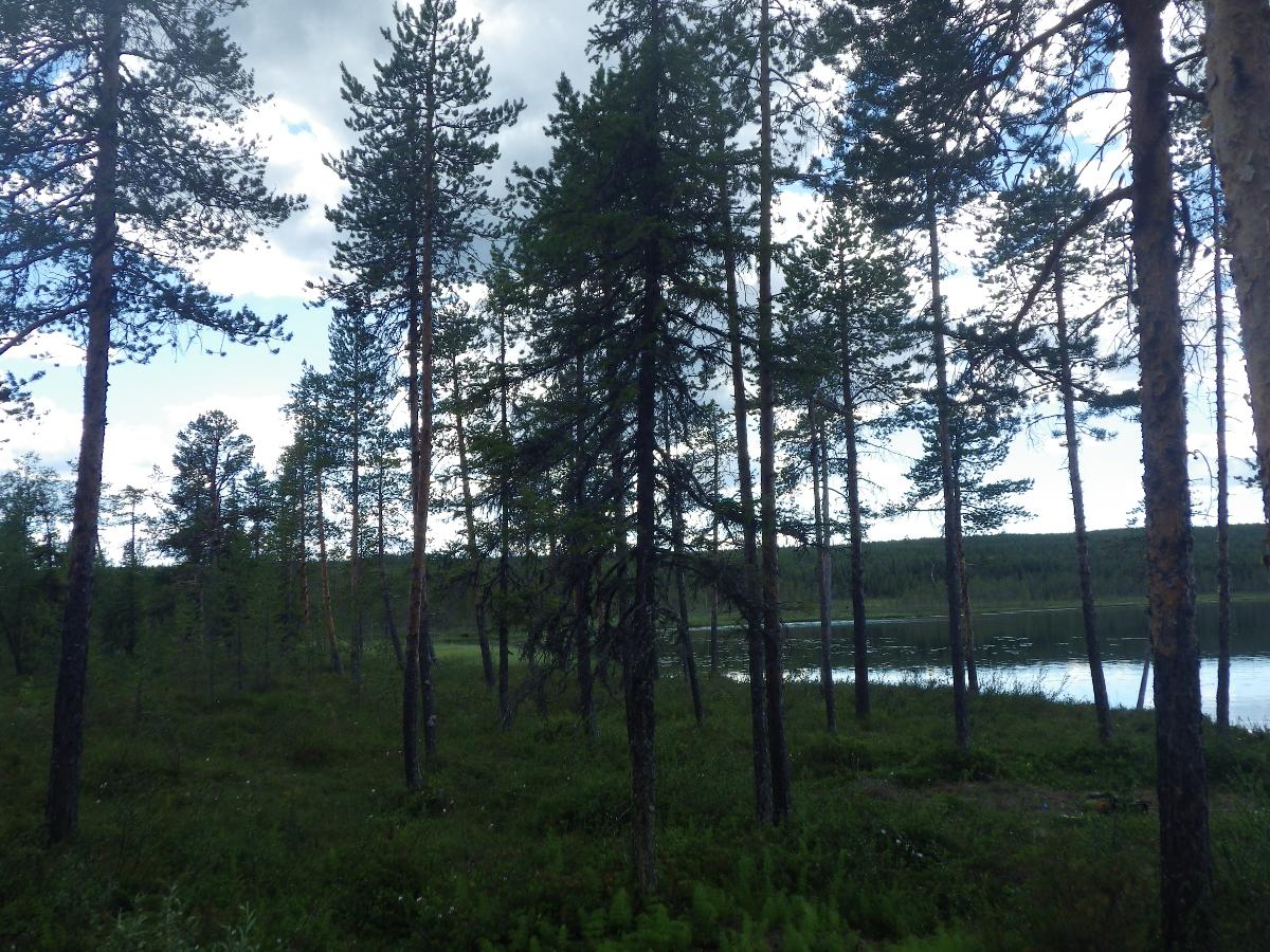 • Biotopbild från tallskogen vid Hierggebieljávrre. Odonvide växer vid stranden, hårslinga ochnordnäckros i sjön. Bilden tagen mot väster.