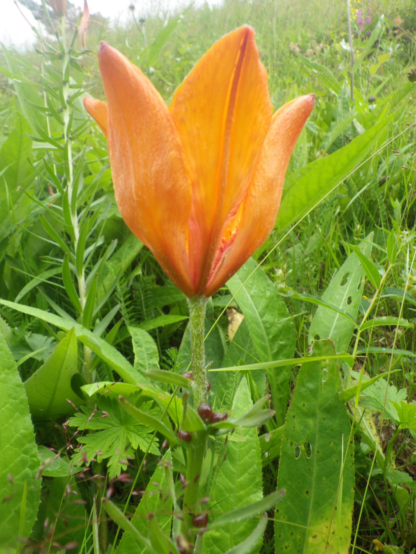 • (Vanlig) brandlilja (AJN:007284), blomma, groddknoppar och hårig stjälk.