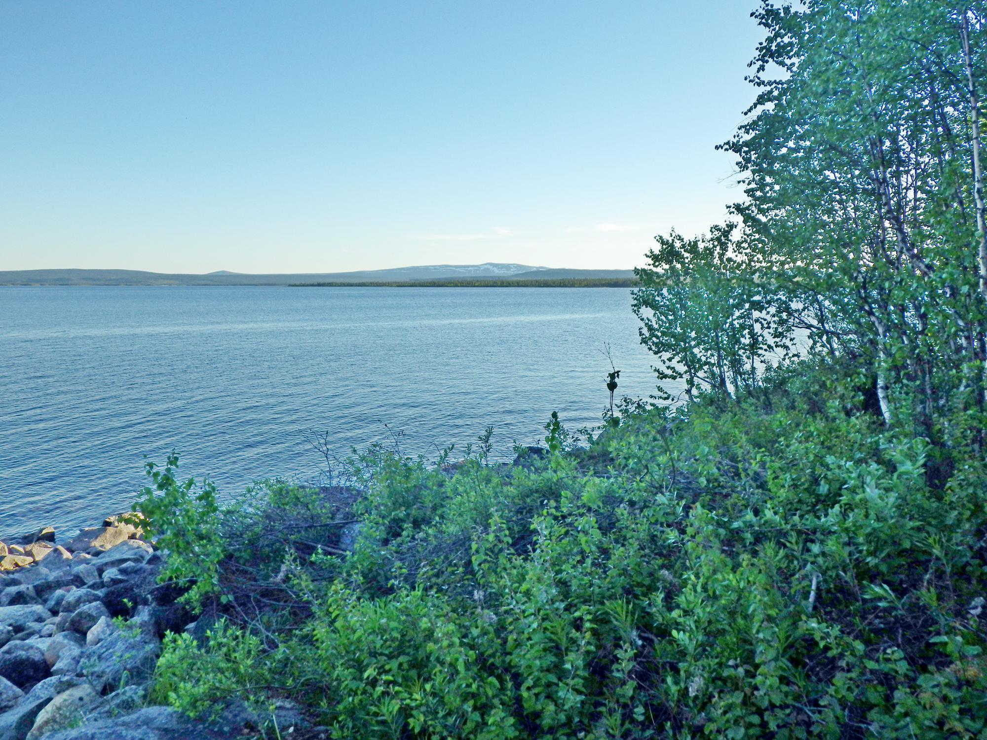 • Biotopbild av stenig sjöstrand med videvegetation. Bilden tagen mot VSV över Ajsjávrre med Niebsurte i bakgrunden.