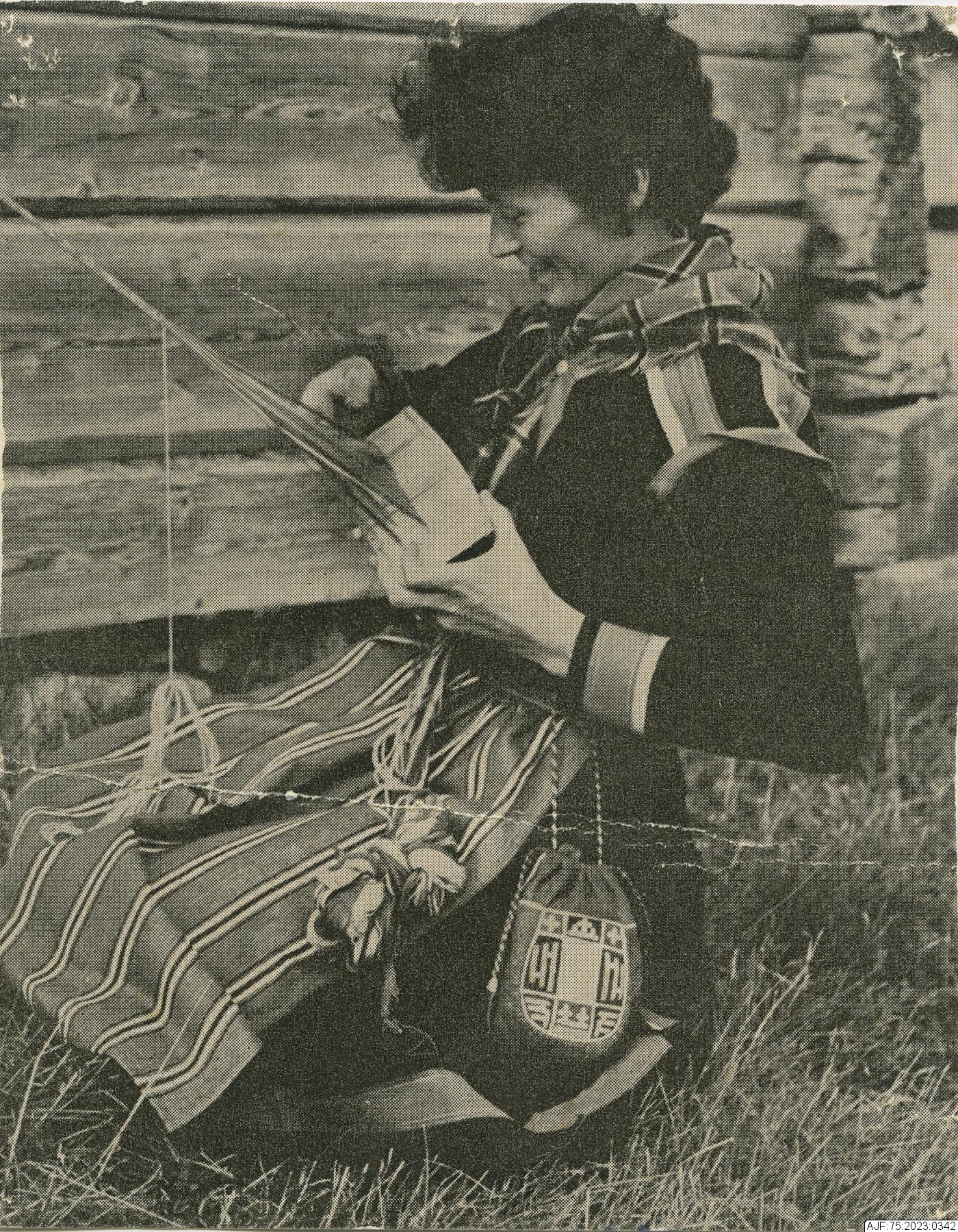• Kvinna i väver band. hon är iklädd Gällivare-varianten av den Jukkasjärvi samiska dräkten. Fotot är ett urklipp ur en tidskrift.