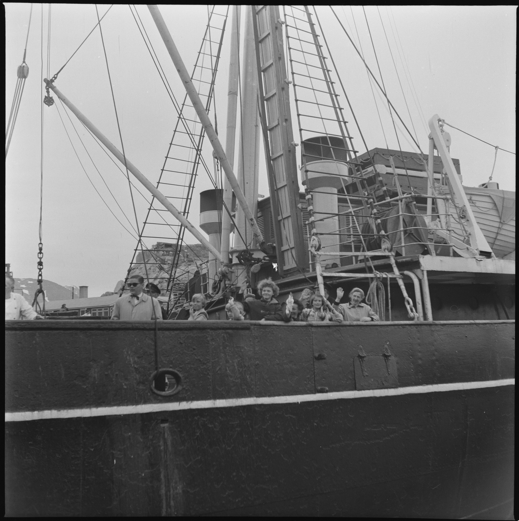 • Passagerare på fartyg med livbåt, master, vant och stag