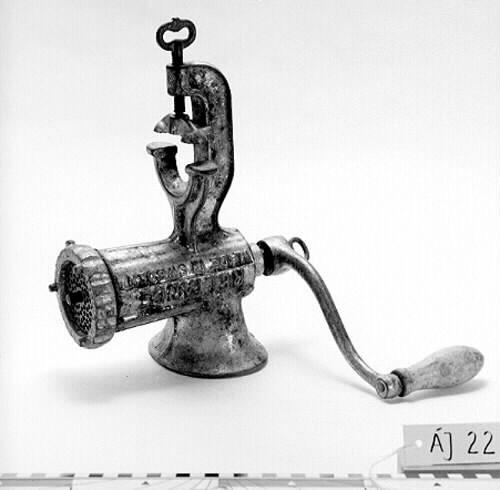 Låsså goarnna. Skruvvit bievddáj. Muorranahta jåråldagan. Tung, handvevad kvarn, som skruvas fast i bord eller bänk. Trähandtag på veven.