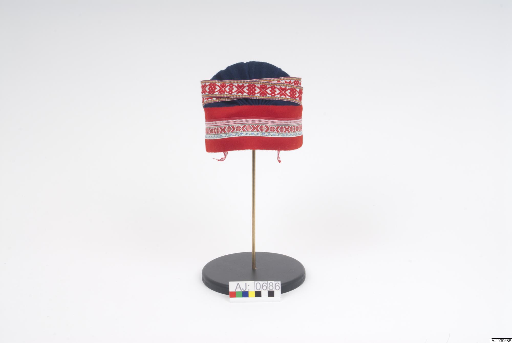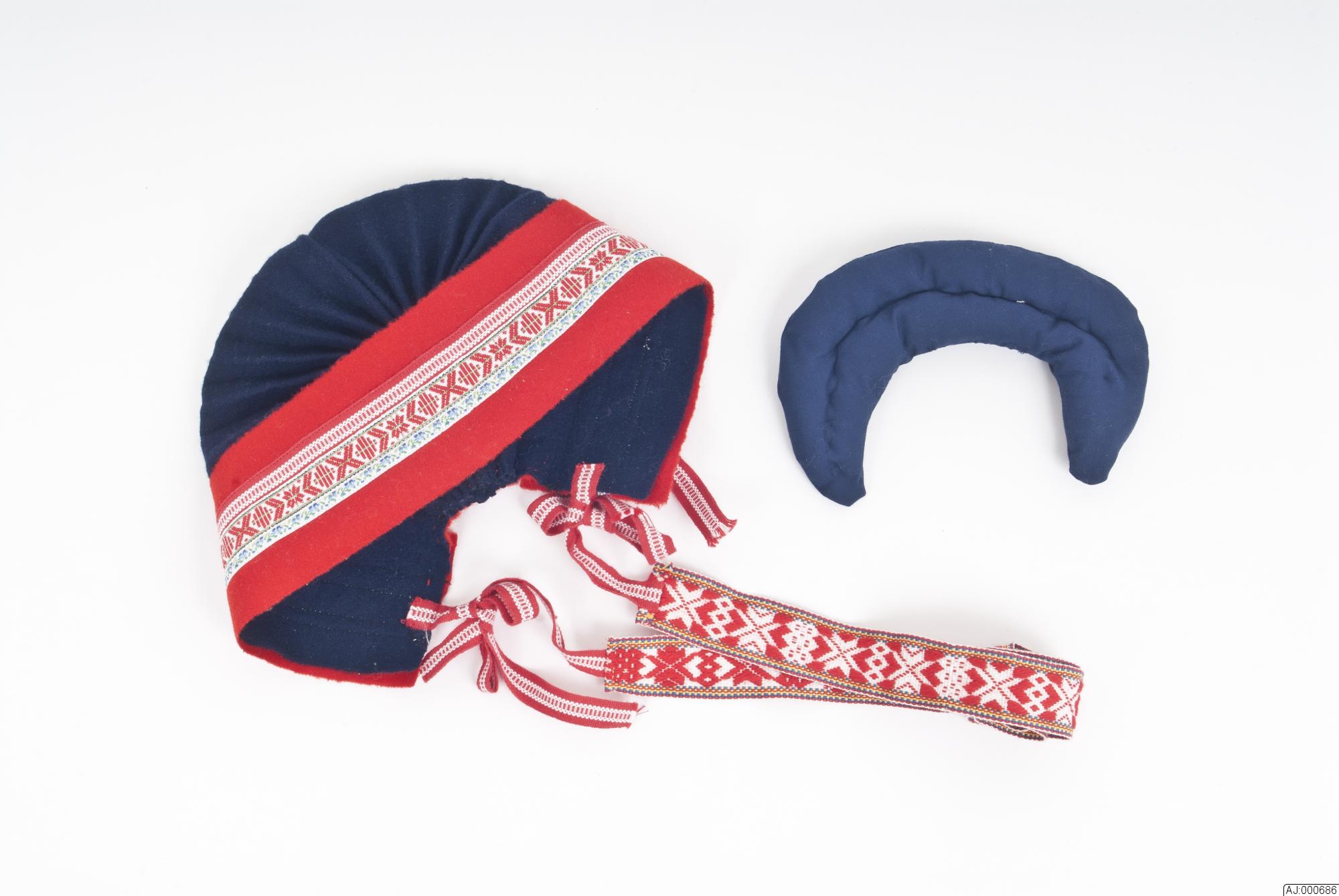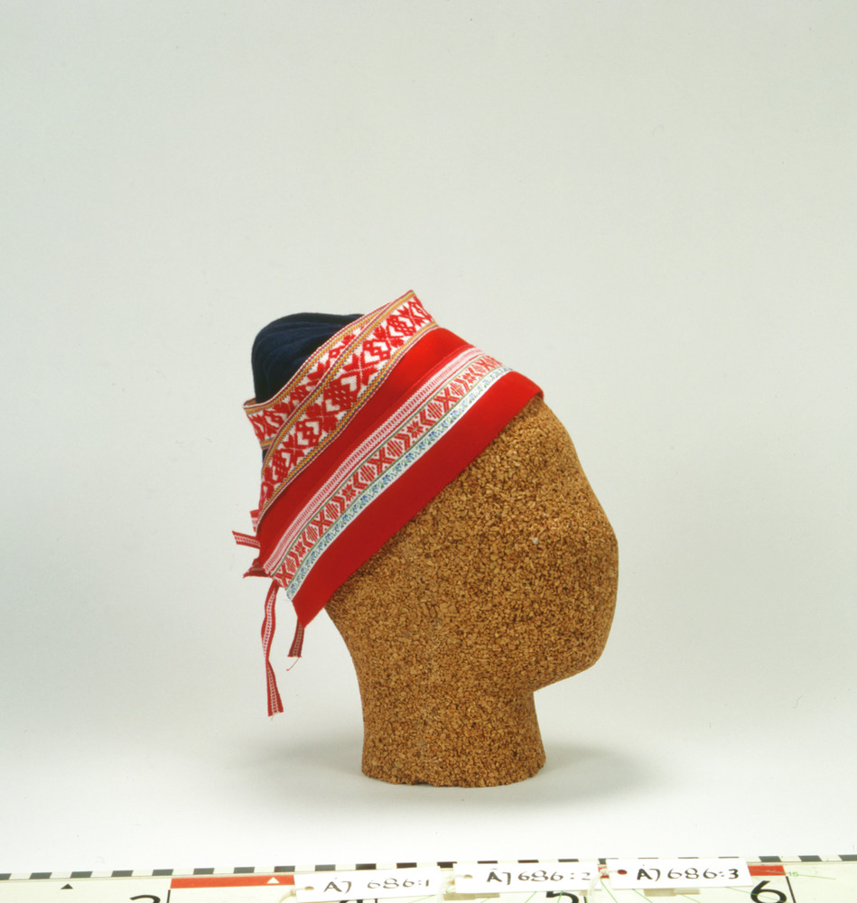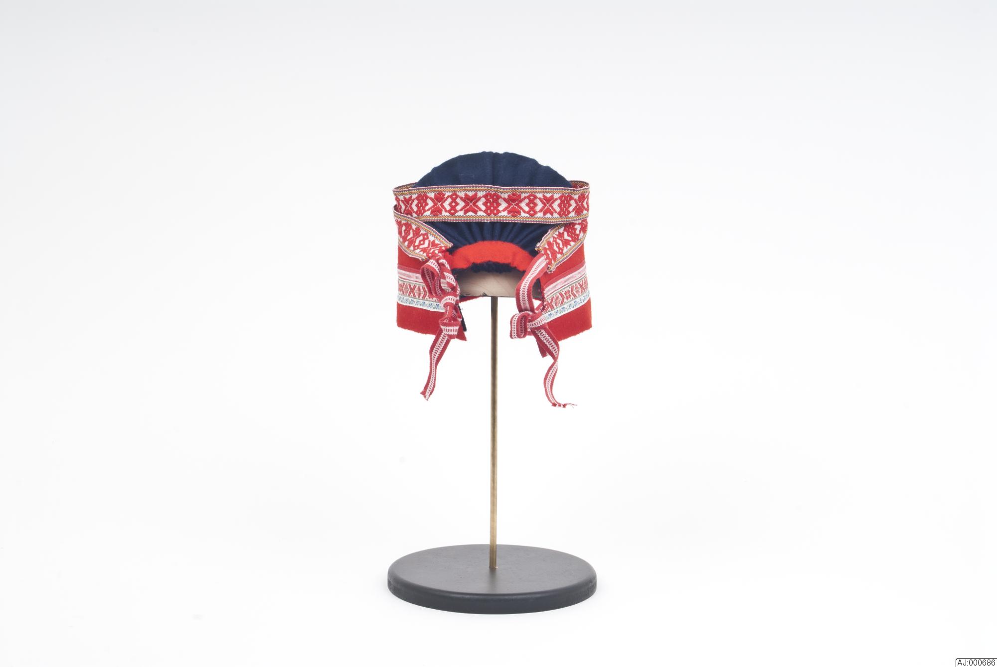 AJ: 686:1 mössa, 2 mössband, 3 valk. 1:Kvinnomössa i blått kläde. Kullen är veckad. Bak är en röd klädesremsa fastsydd, som håller vecken på plats. Omkring kullen är ett vävt band (686:2) lagt. En 7 cm bred klädesremsa är fastsydd i nederkanten. I mitten av klädesremsan har sytts fast 3 maskinvävda band: Överst: vitt-rött band, mitten: vitt-rött-grönt,svart band, nederst: vitt band med blå blommor. Bak på klädesremsan finns två knytband fastsydda. I dem är mössbandet (686:2) fastknutet. 2: Gå/B 2,8 cm. Bottenfärg: vitt bomullsgarn, kanterna blått, gult, rött. Mönster i rött ullgarn. Knytband av vitt-rött maskinvävt bomullsband. Ett knytband fastsytt i varje ände av det handvävda bandet. Mössbandet fastknytet bak i mössan och går två varv runt mössan. Gu/L 128 cm (med knytband) knytband Gu/L 21,7 cm och 23 cm. 3: Halvmåneformad valk med fyllning. Handsöm längs mitten igenom fyllningen. Gu/l 16,5 cm Gå/B 9 cm