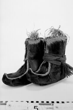 AJ 853:1-2. Bellingsskor av Jokkmokkssamisk modell. Sydd av bruna bellingar. Sömmen utåt i plösen/ovanlädret med mellanlägg av läder. Framsömmen och överkanten har renskinnskantning. Smala över framfoten. Troligen för smala för att kunna användas.