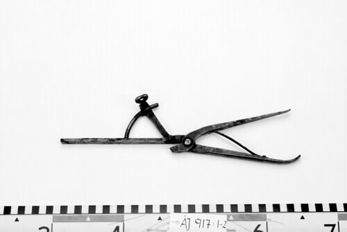 AJ 917:1-2. Skränktång av järn. Tången har två skänklar sammafogade nära ena änden. Mellan skänklarna finns en metallfjäder. I den ena tångdelen är en rörlig metallkonstruktion fastsatt. Denna kan låsas i olika lägen med hjälp av en skruv.