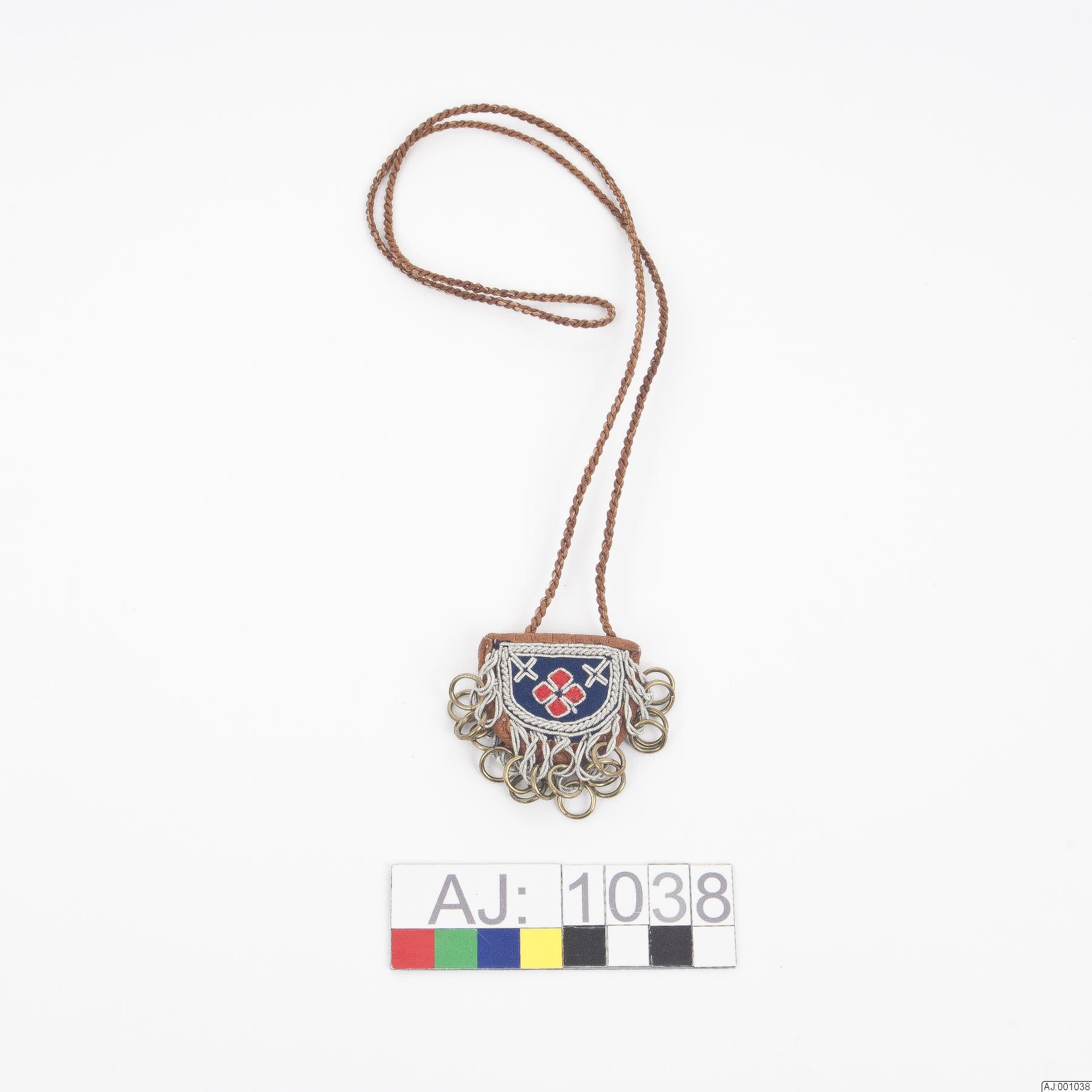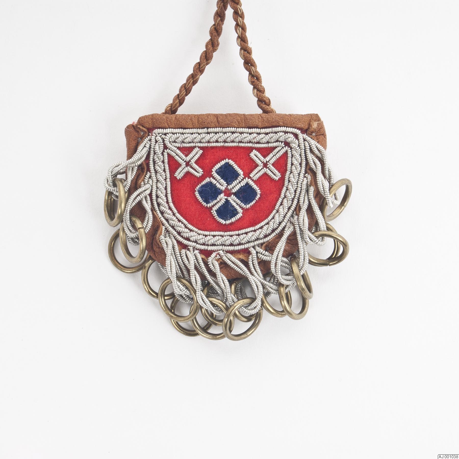 Fingerborgspung, sydd av rött och blått kläde med broderi av runddragen tenntråd. 18 st vridna öglor av dubbel tenntråd med en liten mässingsring i varje. Påsen är kantad med skinn, fodrad med rött bomullstyg. Skinnsnodd av 2 remsor, 68 cm sydd på insidan.