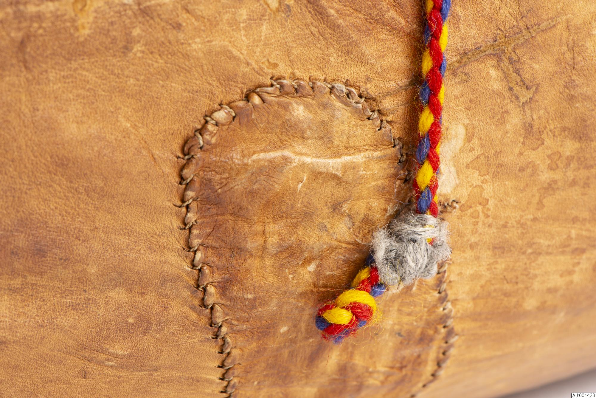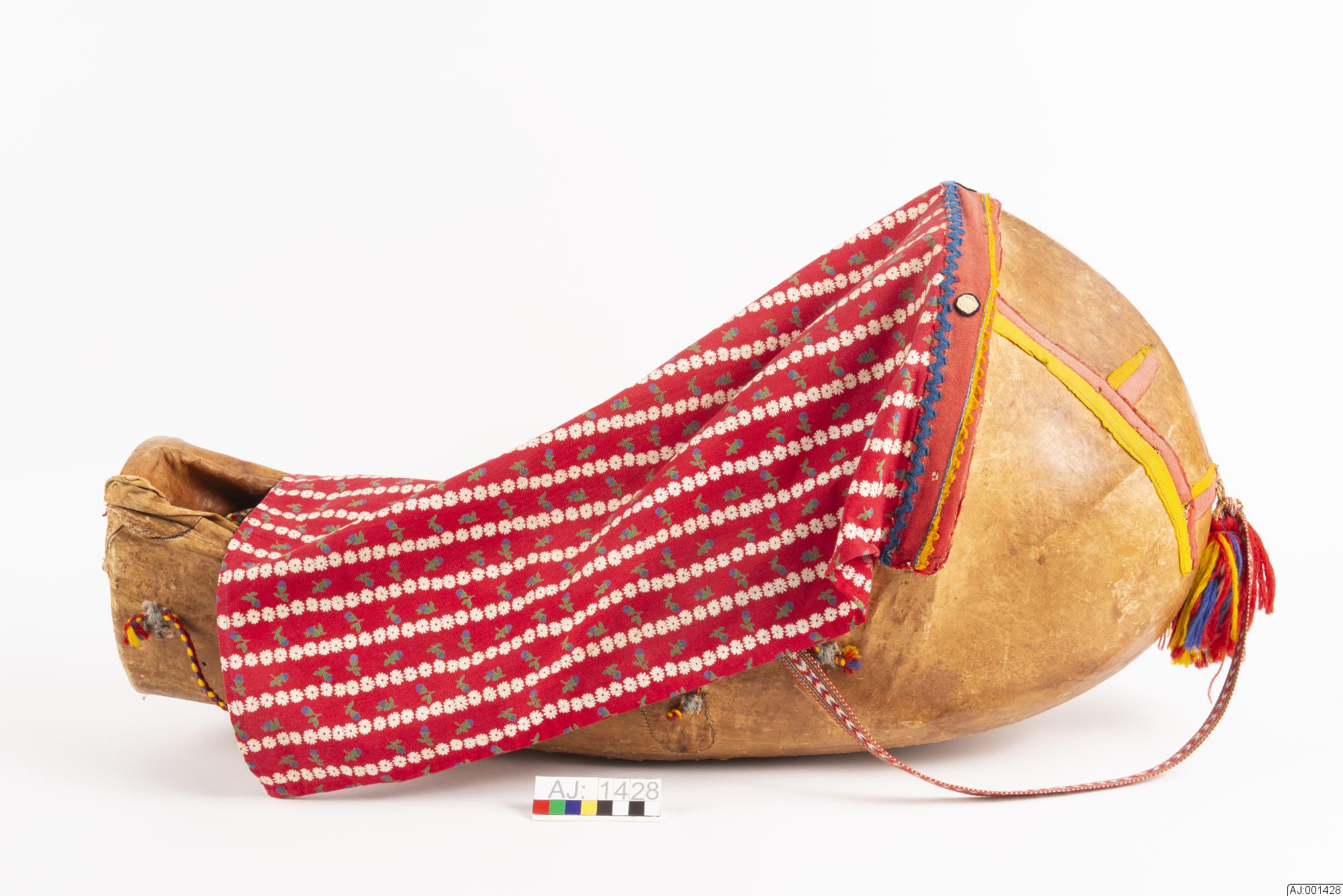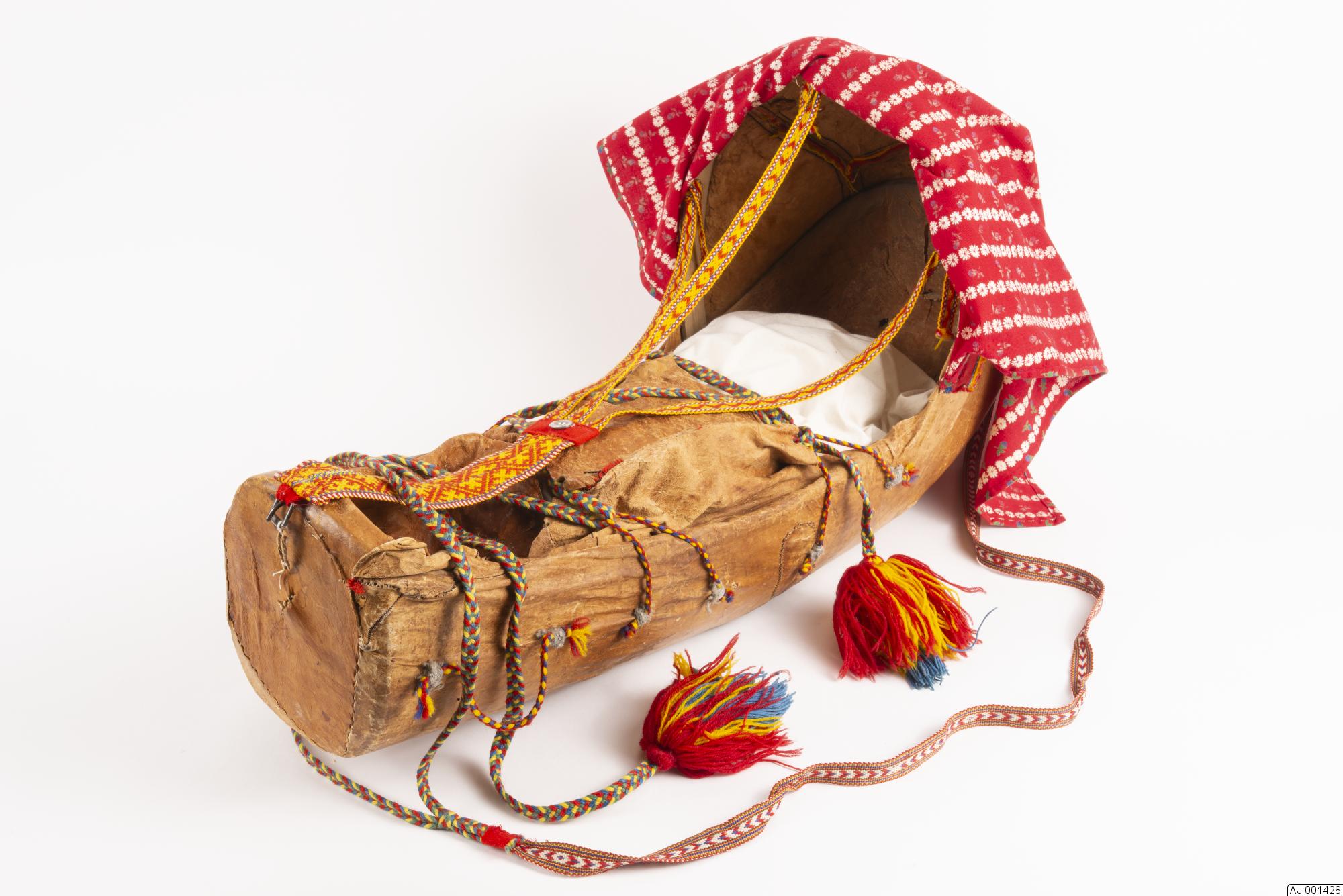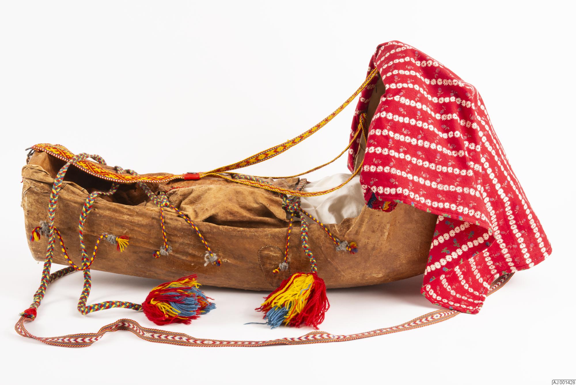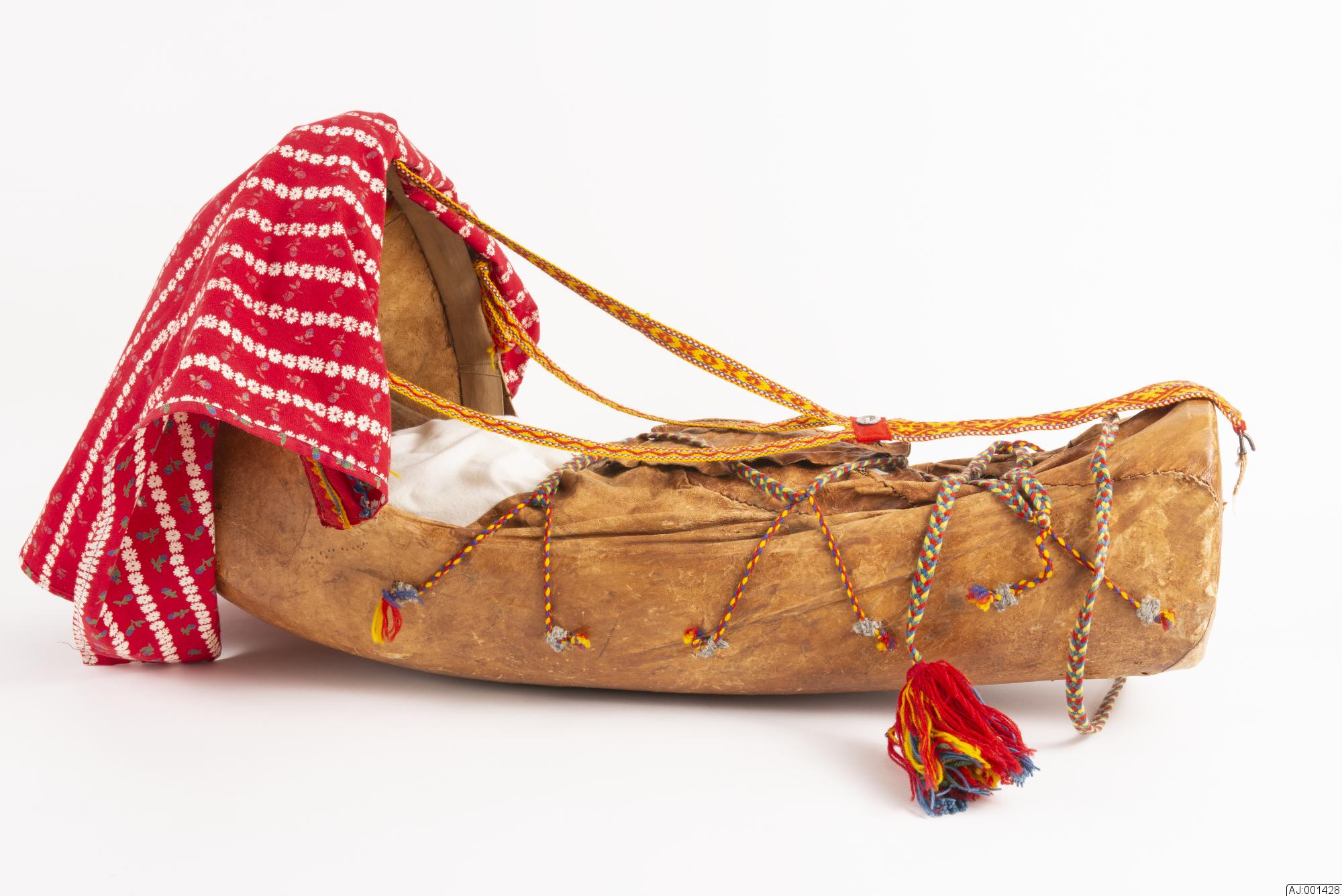 Nordsamisk vagga. Träet är sprucket vid huvudet. Klätt i skinn, skinnet är lappat på en del ställen, baktill är det skarvat. En del av skarvningarna är gjorda för hand, endel är sydda på maskin. Mellan en del sömmar har det varit kläde som mellanlägg. Öglorna i sidan är gjord i garn. (4-flätade runda snoddar i blått, gult, rött) som knytband är det ett flätat band på 8 trådar (gul, röd, grön, blå)...