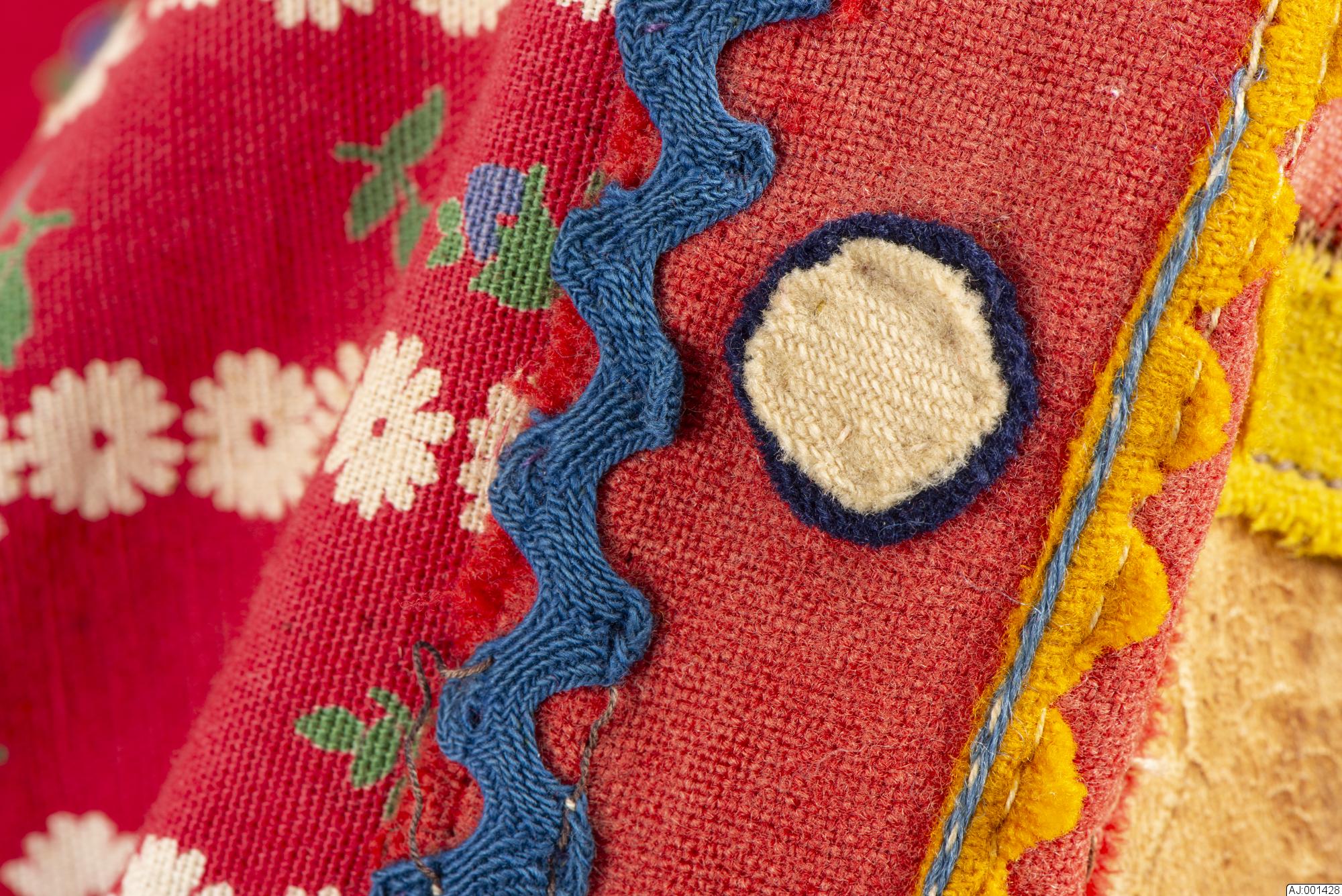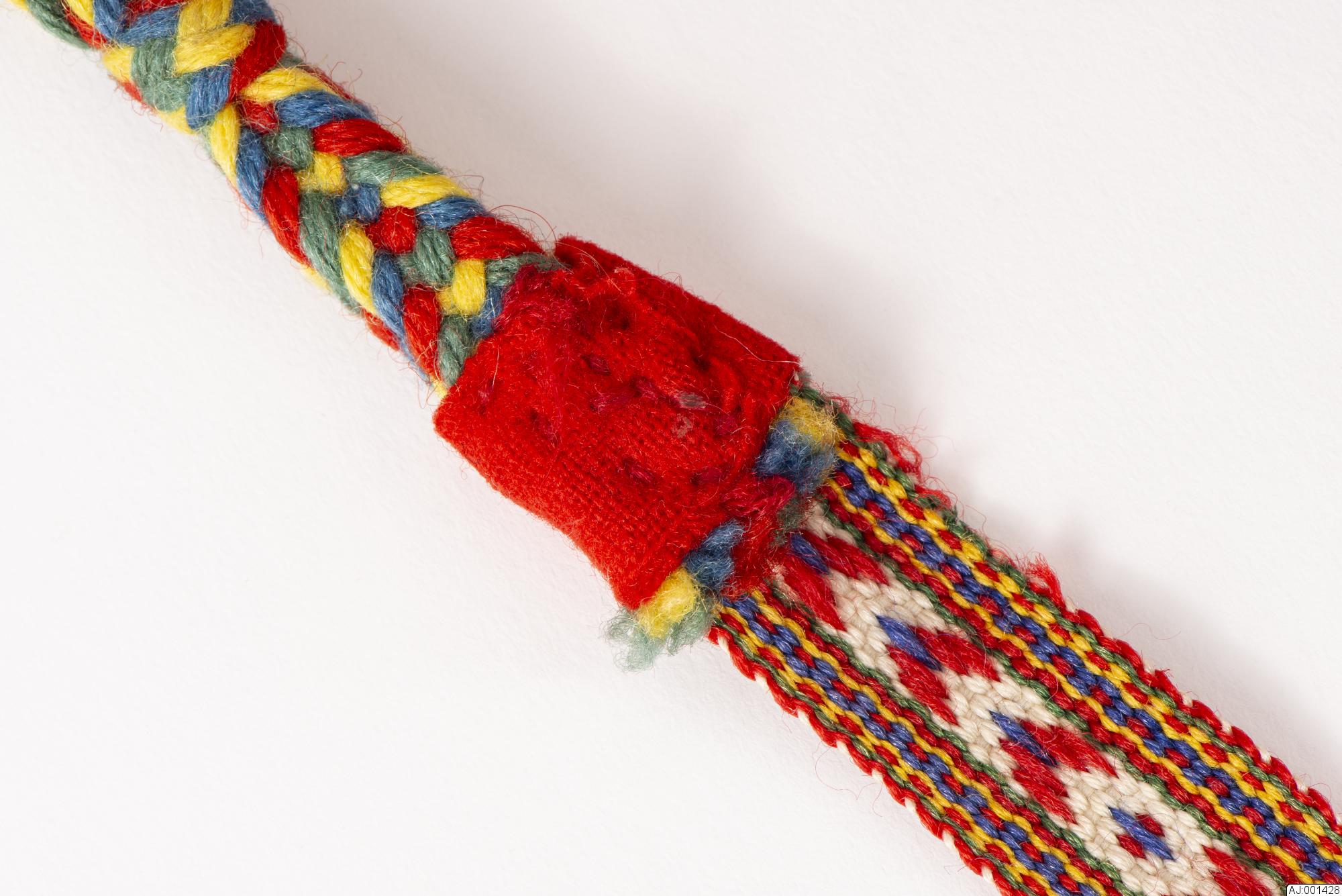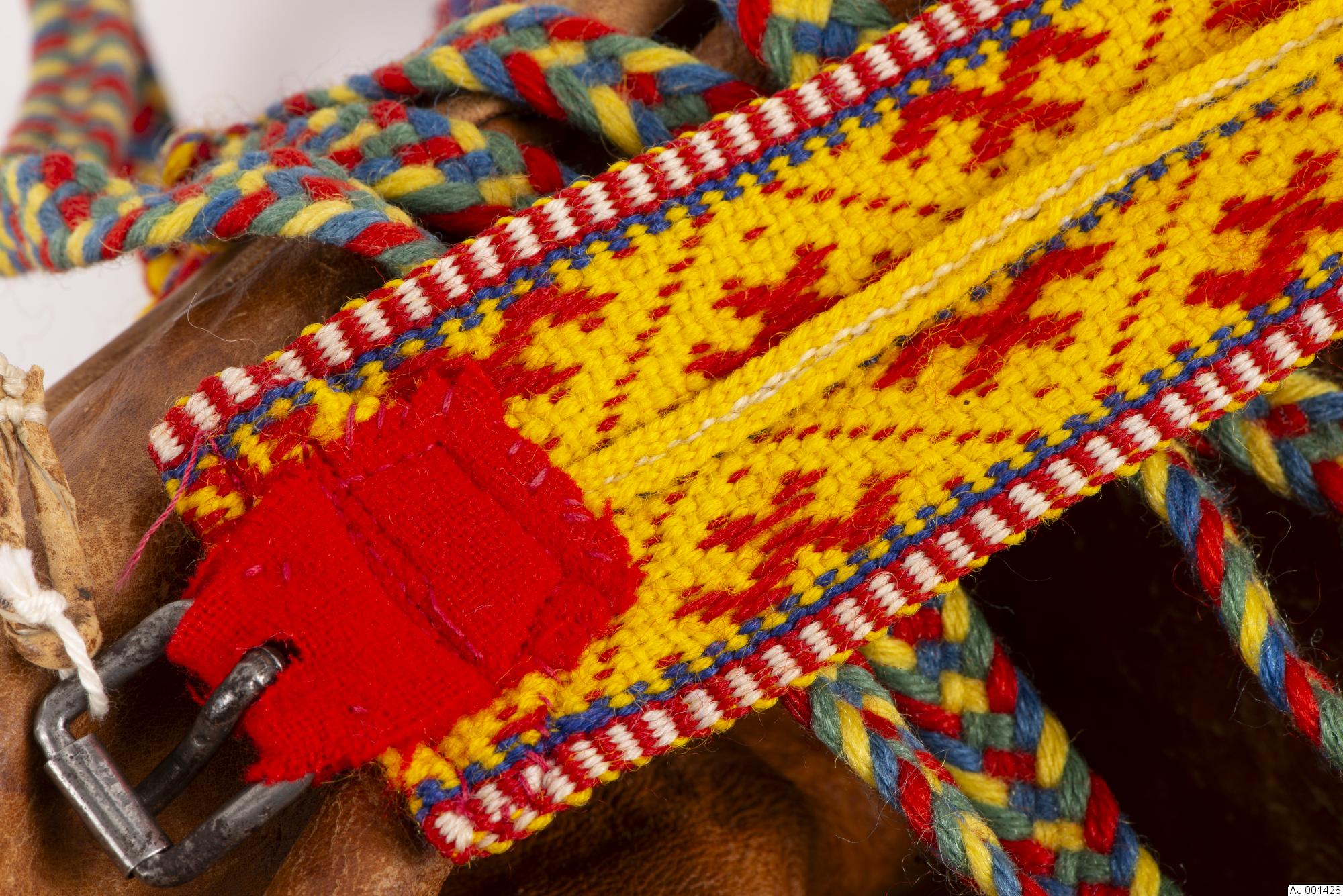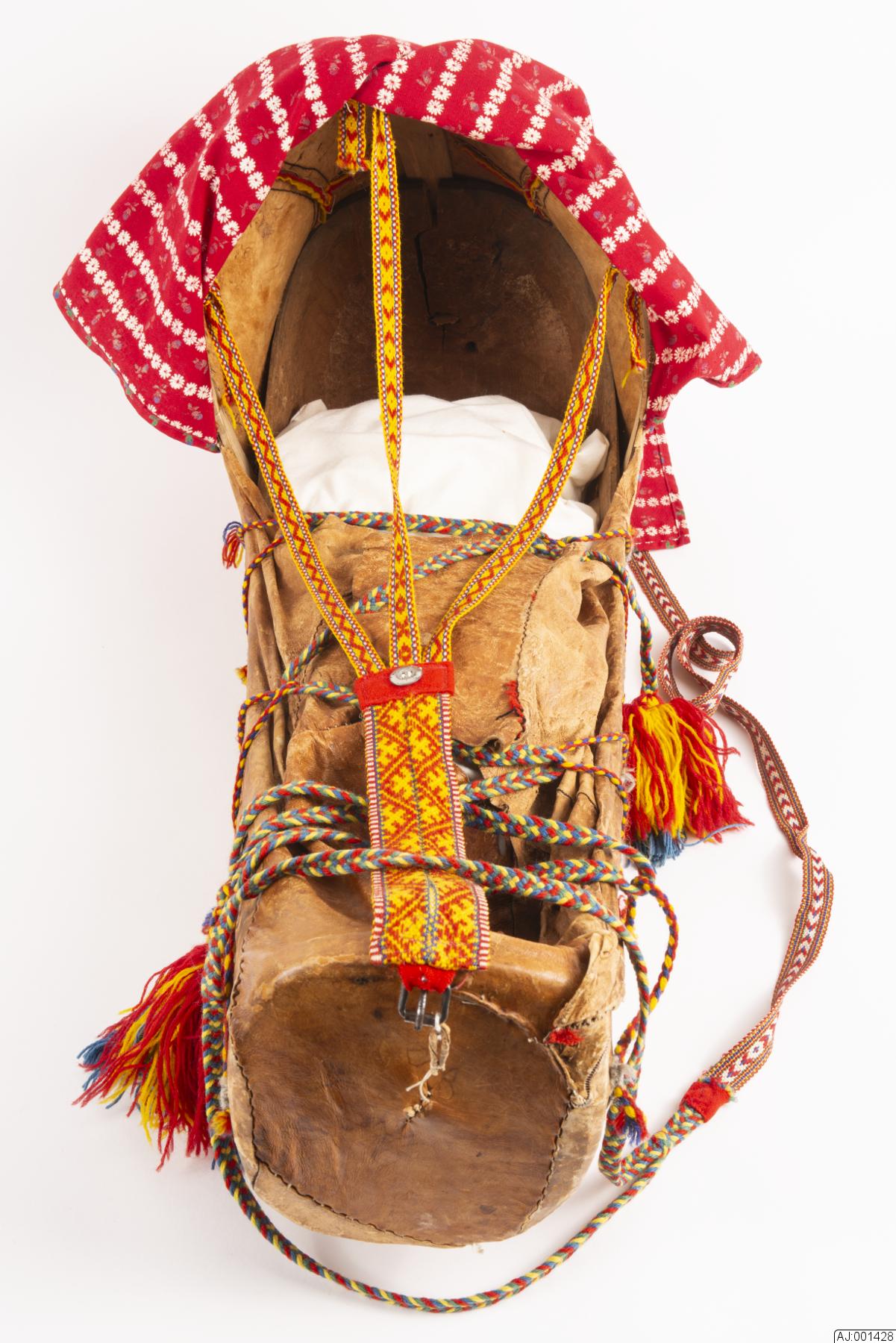 Nordsamisk vagga. Träet är sprucket vid huvudet. Klätt i skinn, skinnet är lappat på en del ställen, baktill är det skarvat. En del av skarvningarna är gjorda för hand, endel är sydda på maskin. Mellan en del sömmar har det varit kläde som mellanlägg. Öglorna i sidan är gjord i garn. (4-flätade runda snoddar i blått, gult, rött) som knytband är det ett flätat band på 8 trådar (gul, röd, grön, blå) i var ända är det en garntofs. Själva vaggbandet (som bär upp tyget) är vävt med gul botten o röda mönstertrådar. Först 3 smala band o där dom sammanstrålar o går över till ett brett band är det fastsytt med en röd klädesbit med en metallknapp på. Det breda bandet består av 2 vävda band som är ihopsydda. Längst bak på bandet sitter ett spänne för fäste. Detta spänne är fäst med rött kläde. Längd på hela bandet ca. 62,5 cm. Bredd på det breda bandet: 4,2 cm Bredd på det smala bandet: 1,3 cm över vaggan är ett rött tyg med blommönster längd ca 54 cm främre delen av vaggan är dekorerad med kläde, rött & gult. Detta är fastsytt med maskin. I mitten fram är det en ögla i skinn där bärbandet är fastknytt. Bärbandet är vävt. Vit botten med röda + 1 blå mönstertråd. Vid knuten fram; en tofs i garn. Det vävda bandet är ca. 1,12 m långt &:1,5 cm bred. Den är fastsydd med ett flätat band (samma band som för ihopknytningen) o denna är fastsydd som en ögla. (för att man ska kunna haka fast den under vagg-slutet) Rött kläde som täcker fästet. Högst upp på bågen är den dekorerad med rött kläde + blått zig-zackband o gult kläde, zig-zack-klipp med en blå ulltråd på) 3 prickar på det röda klädet med bla botten o vitt tyg på. En prick på mitten & en på var sida. OBS lös knapp medföljer.