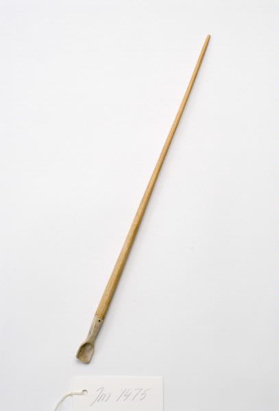Pinnen av trä, "skeden" av horn.Dekor. med tvärgående streck på hornet.