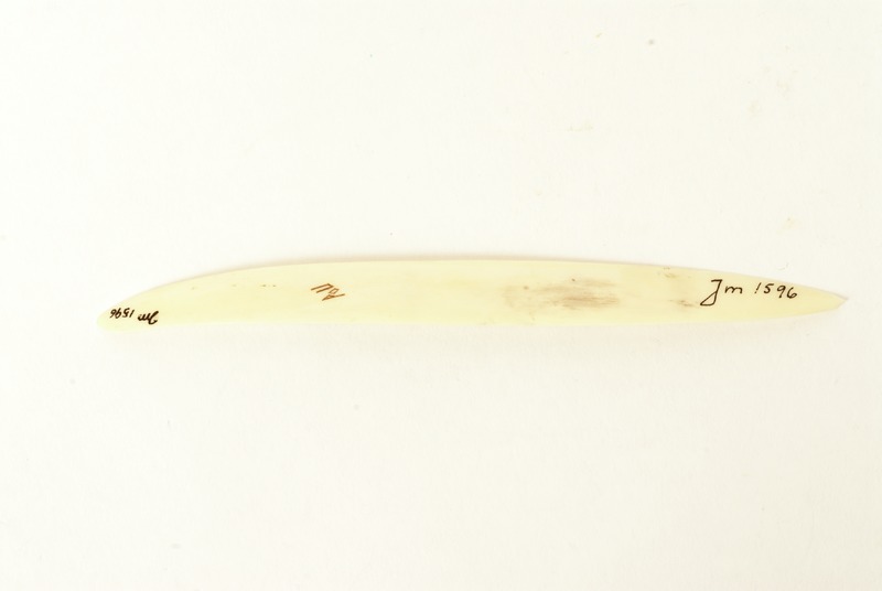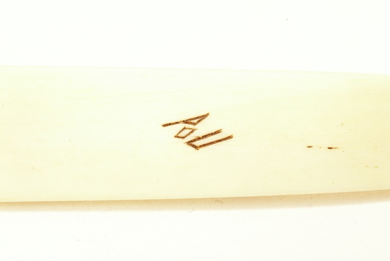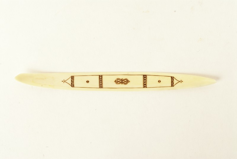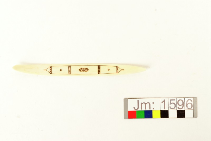 Papperskniv i horn. Avsmalnande och något uppåtlutande i ändarna. Nordsamiskt ornament, i mitten från Rautasvuoma - Kalasvuoma samebyar enl. Utsi. Tillverkarens signatur på undersidan. Trasig i en ände.