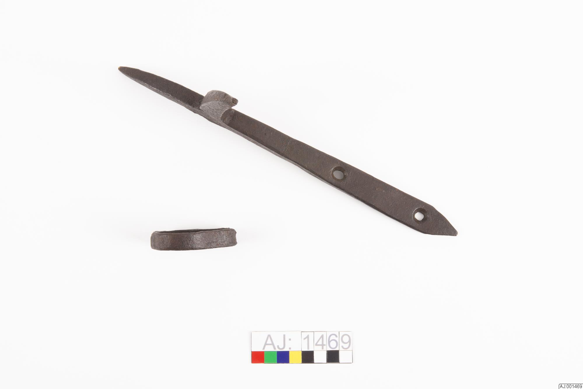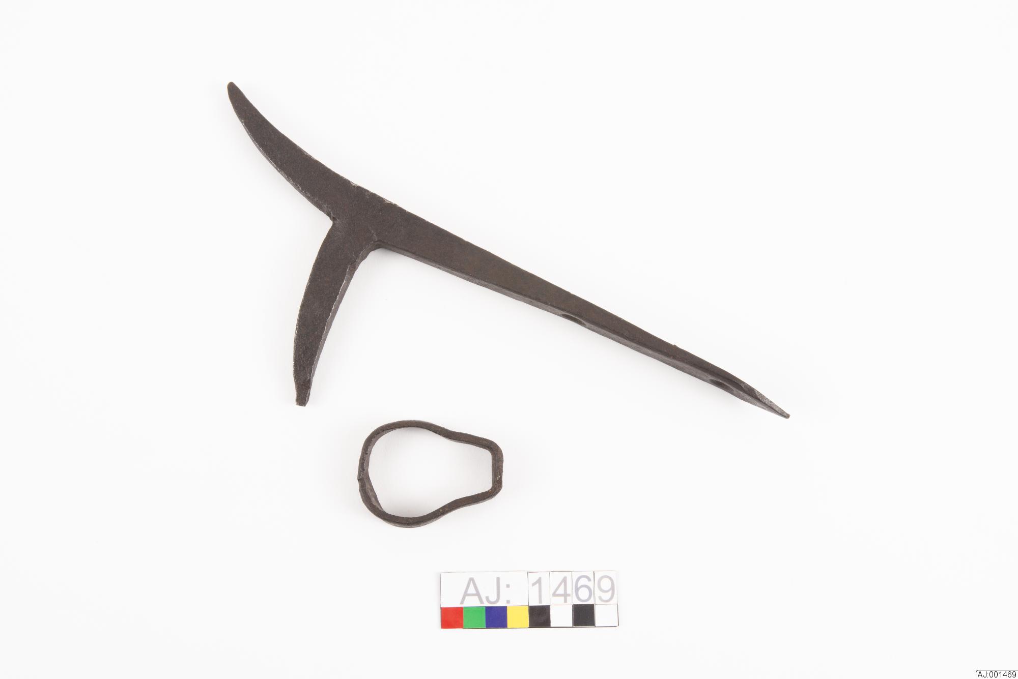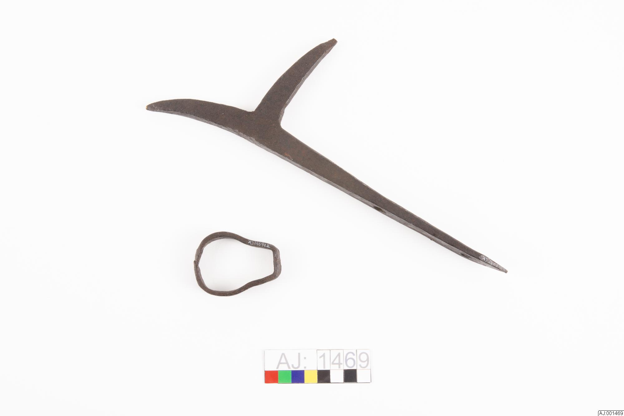 • AJ:001469:1-2 skaft saknas. Haken har 2 hål att fästa den i skaftet med. Se skiss.