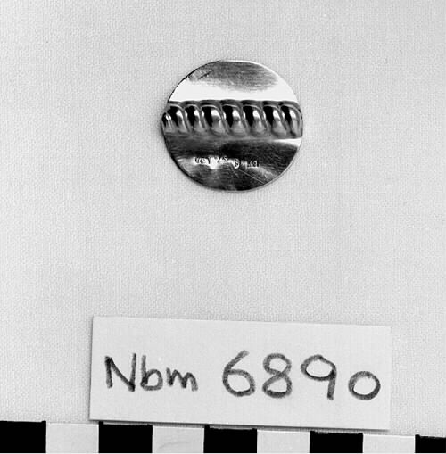 Rund platt form. Larvornament som dekor. Ornamentet sträcker sig över hela diagonalen. Ögla på baksidan för fastsyning. Stämplar: 0SE-tre kronor-S-Haparanda stadsstämpel-Z7.