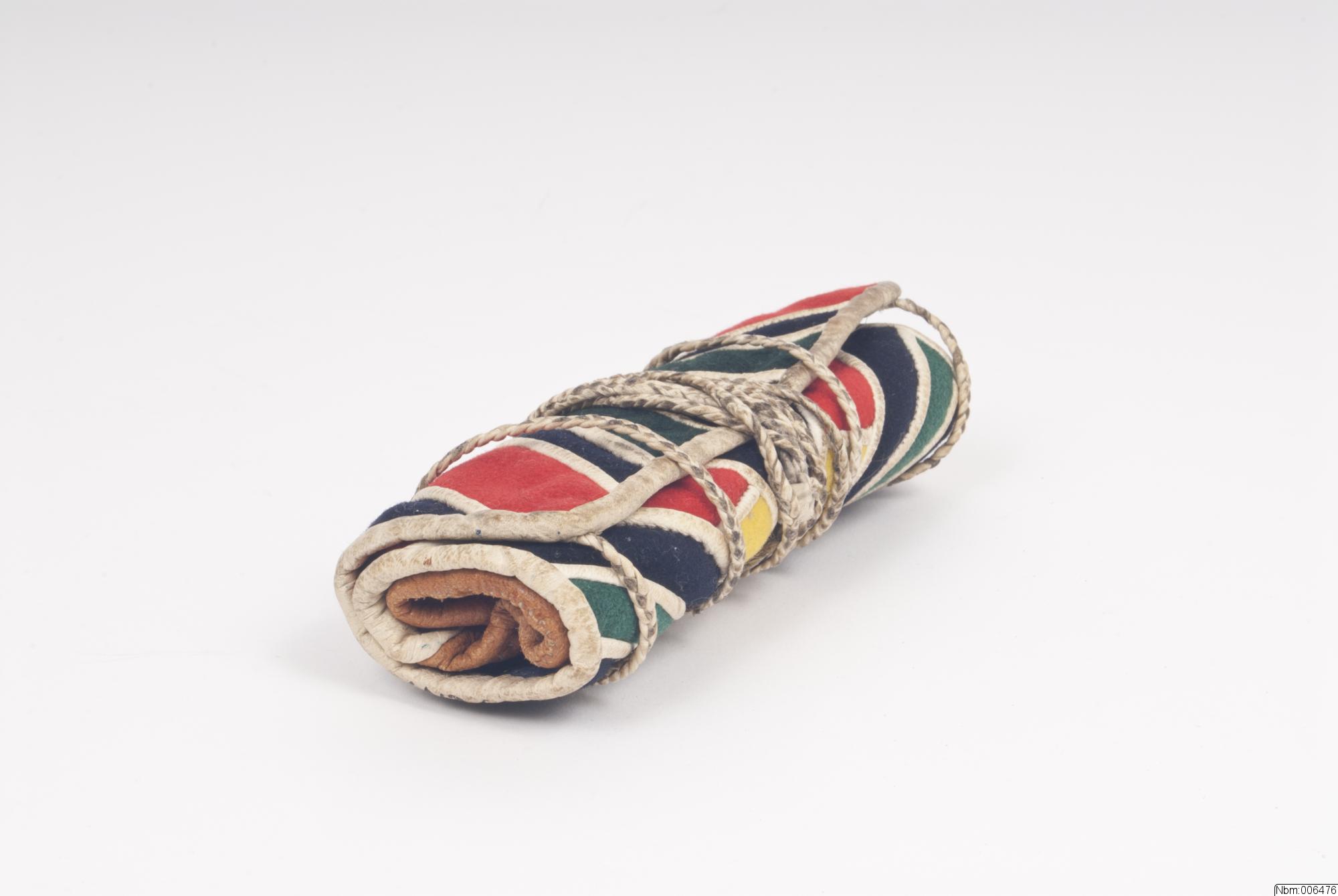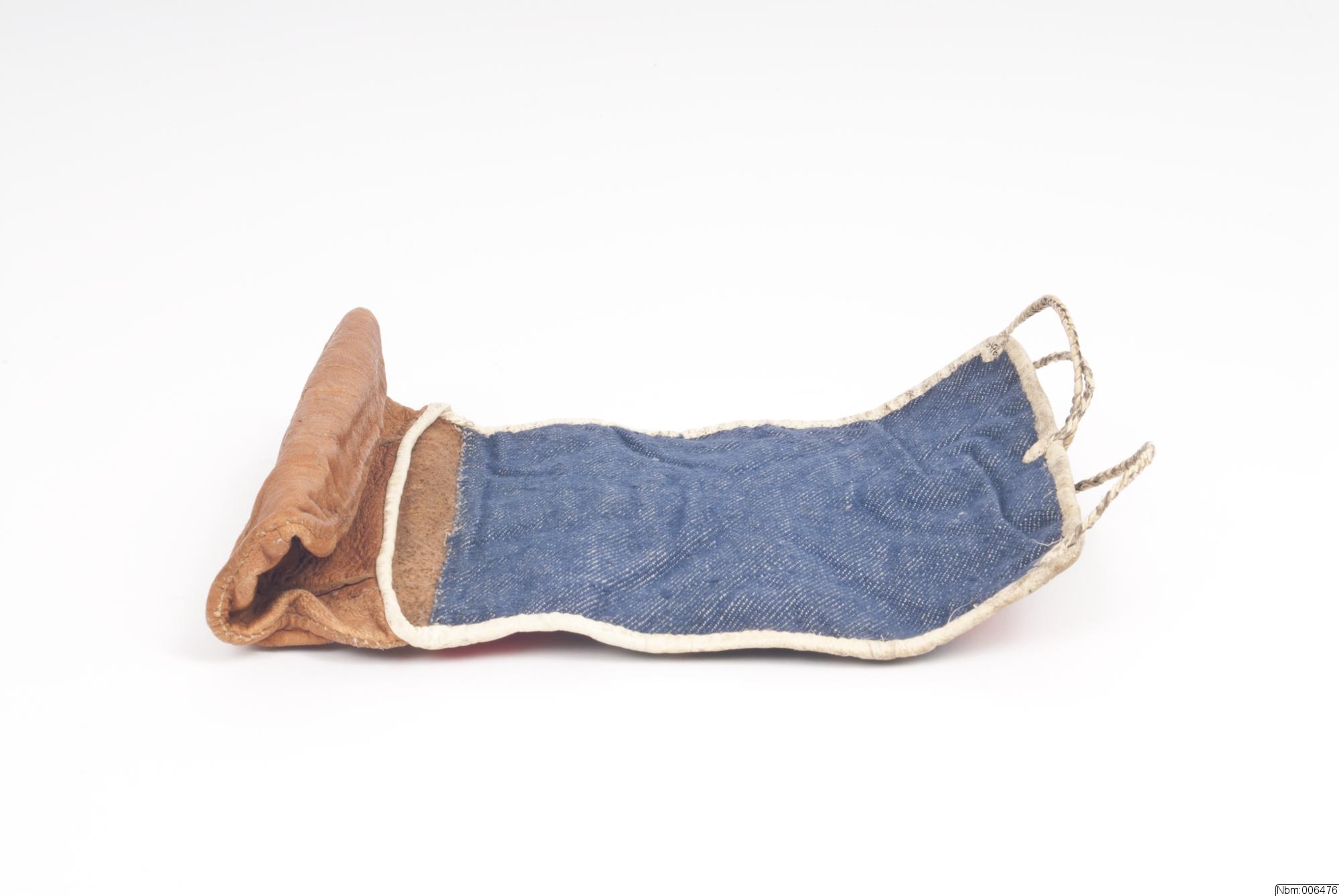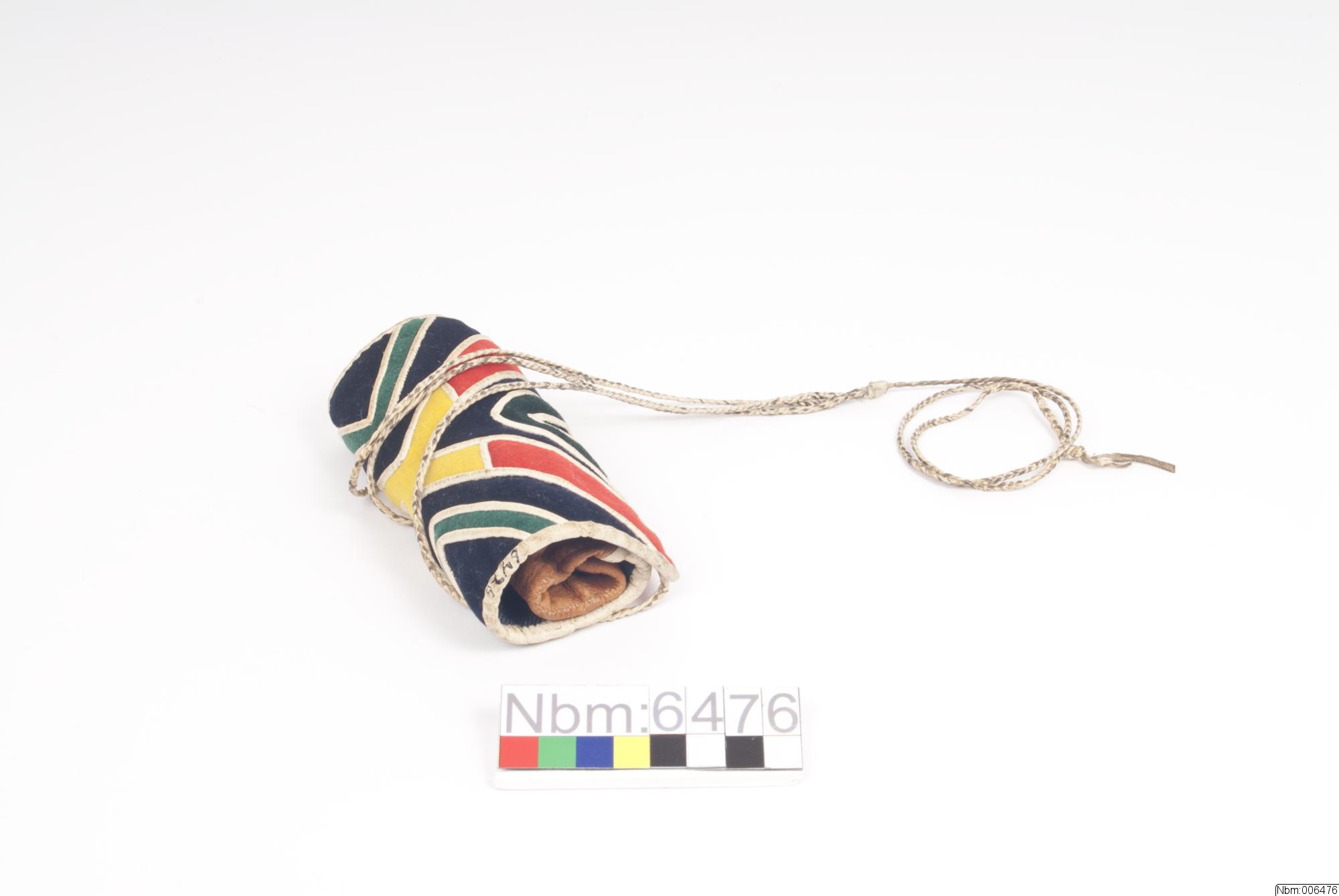 • Pung i garvat skinn. Lock i bomullstyg täckt med kläde samt applikationer i kläde och vitt skinn. Snoddar i vitt skinn att knyta med.