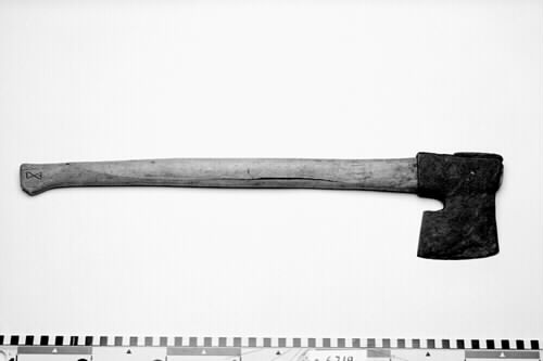Skaft av trä med blad av järn. Träskydd på bladet vilket fasthålles med skinnremmar. Bomärke på skyddet och längst ner på skaftet. Anm 23/8-04: skaft av björk/ Bengt Rosén