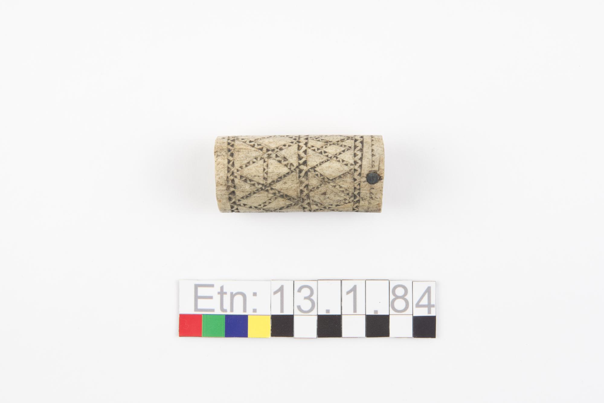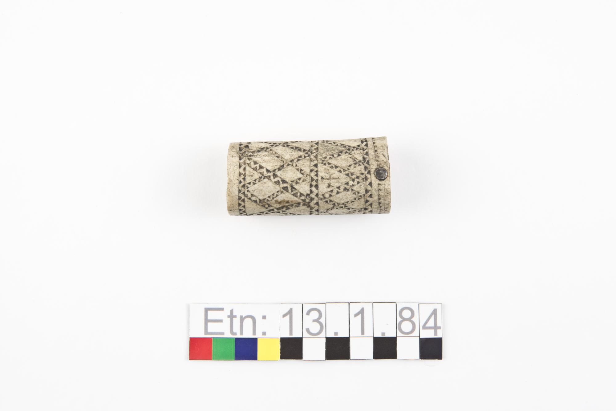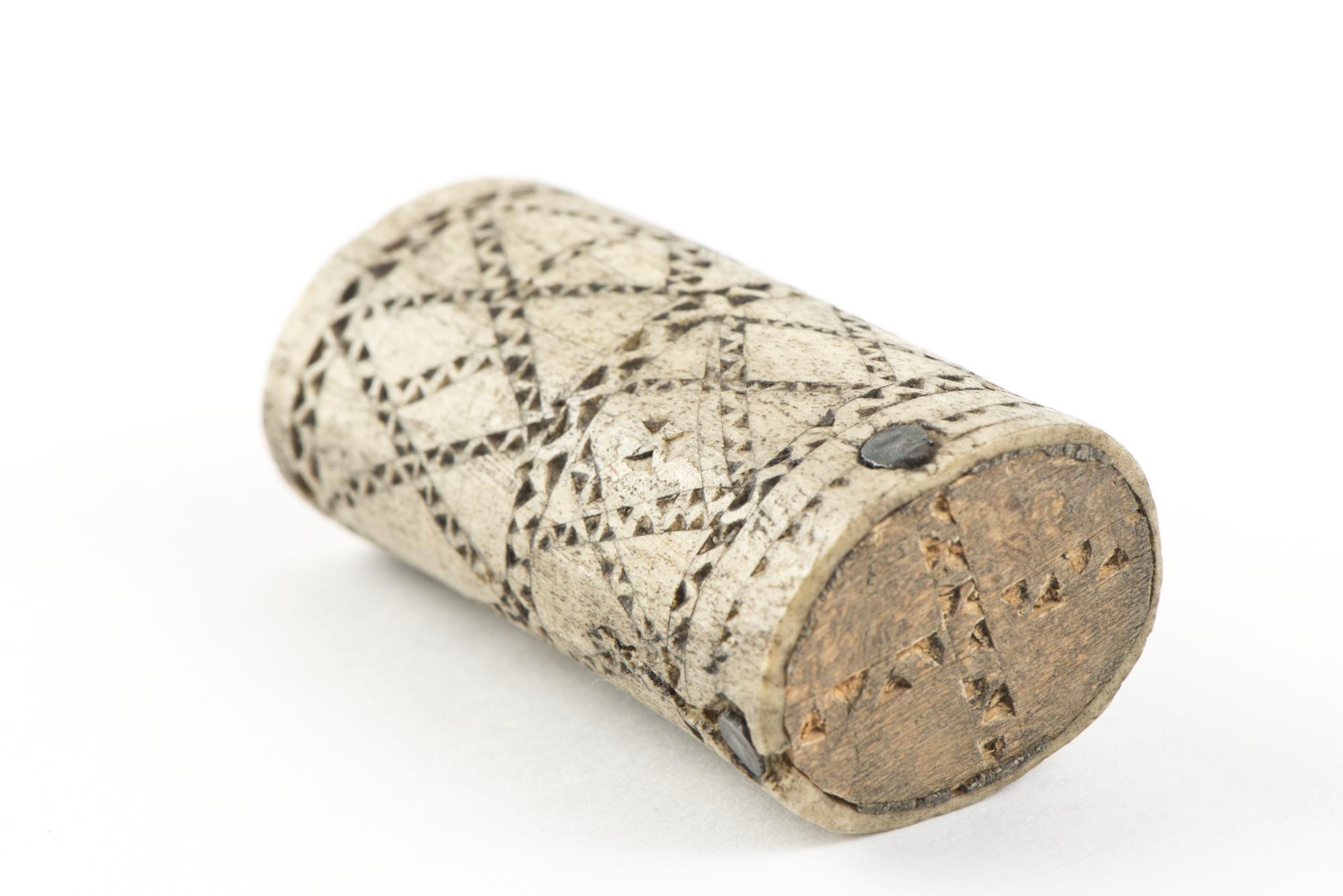 • Tändsticksdosa av renhorn, inristade zigzaglinjer bildar rutformiga ornament. Botten är av trä, lock saknas.