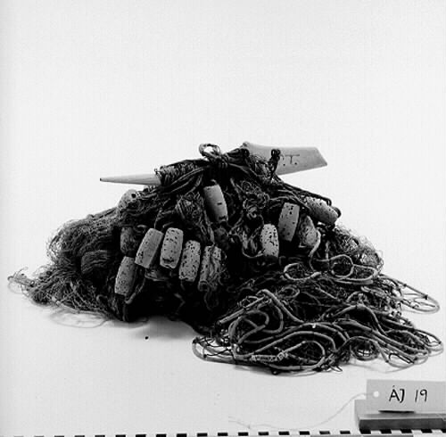 Övertelnen består av korkbitar och nederdelen av blyteln. Trästickan har initialerna "ST" inristat. Grönfärgad. Brukaren har bott (bundit) under- och övertelnen själv. Badjosen lera goarkat ja vuollosen lea ládjubáddi. Muorrasákkin le ST ceahkkin. Ruonán bainun.