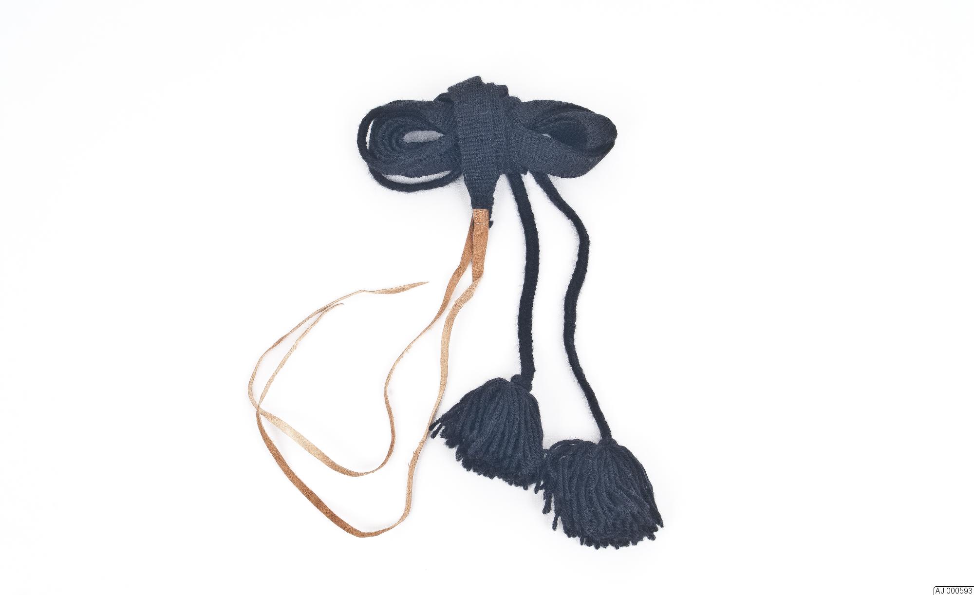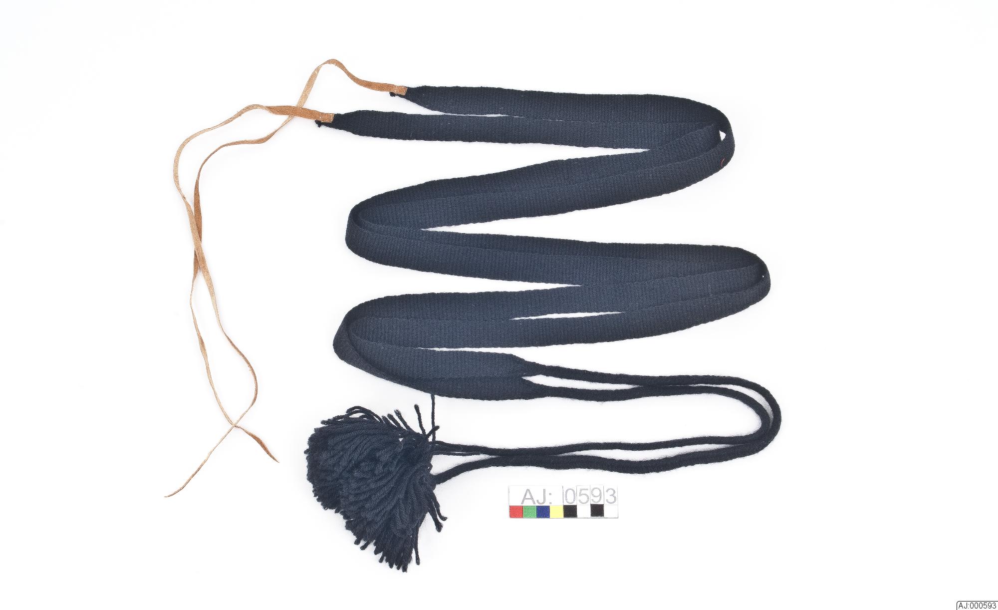 Ett par skoband. Vuodda gu 108 cm. Bargaldis gu 52 cm, dohppa 7 cm. Gartsa 49,5 cm li sassnes. Åvddåla 1950 gárana giessen adnin tjáppes vuoddagijt bárgguvuoddagin. Dáhkkin adnin muhtem bondorat. Bandets längd 108 cm. Flätade knytbandet 52 cm, tofs 7 cm. Knytbandet mot skon är av skinn och 49,5 cm långt. Före 1950 använde männen svarta skoband som bruksskoband. Sådanan använde en del bönder.