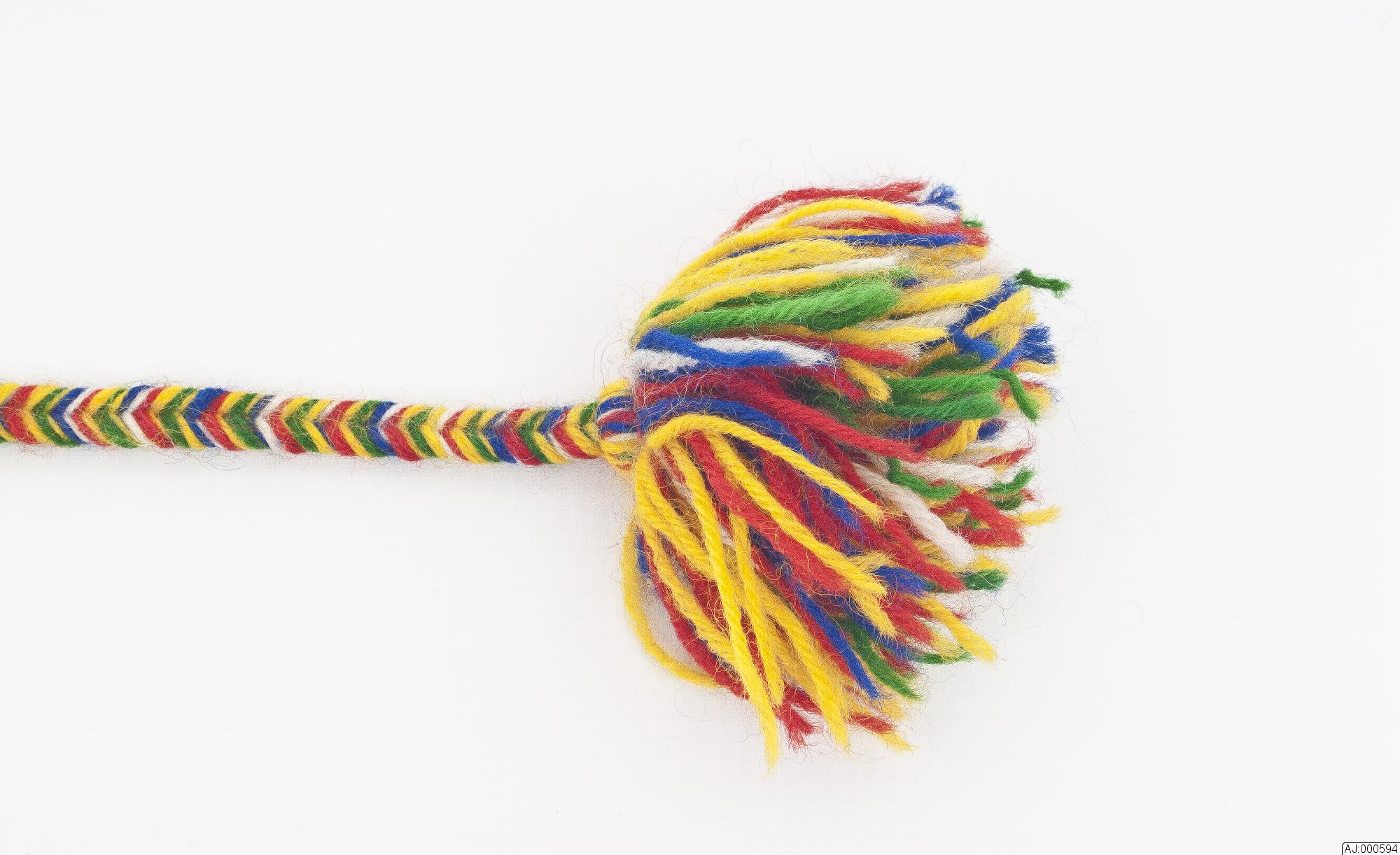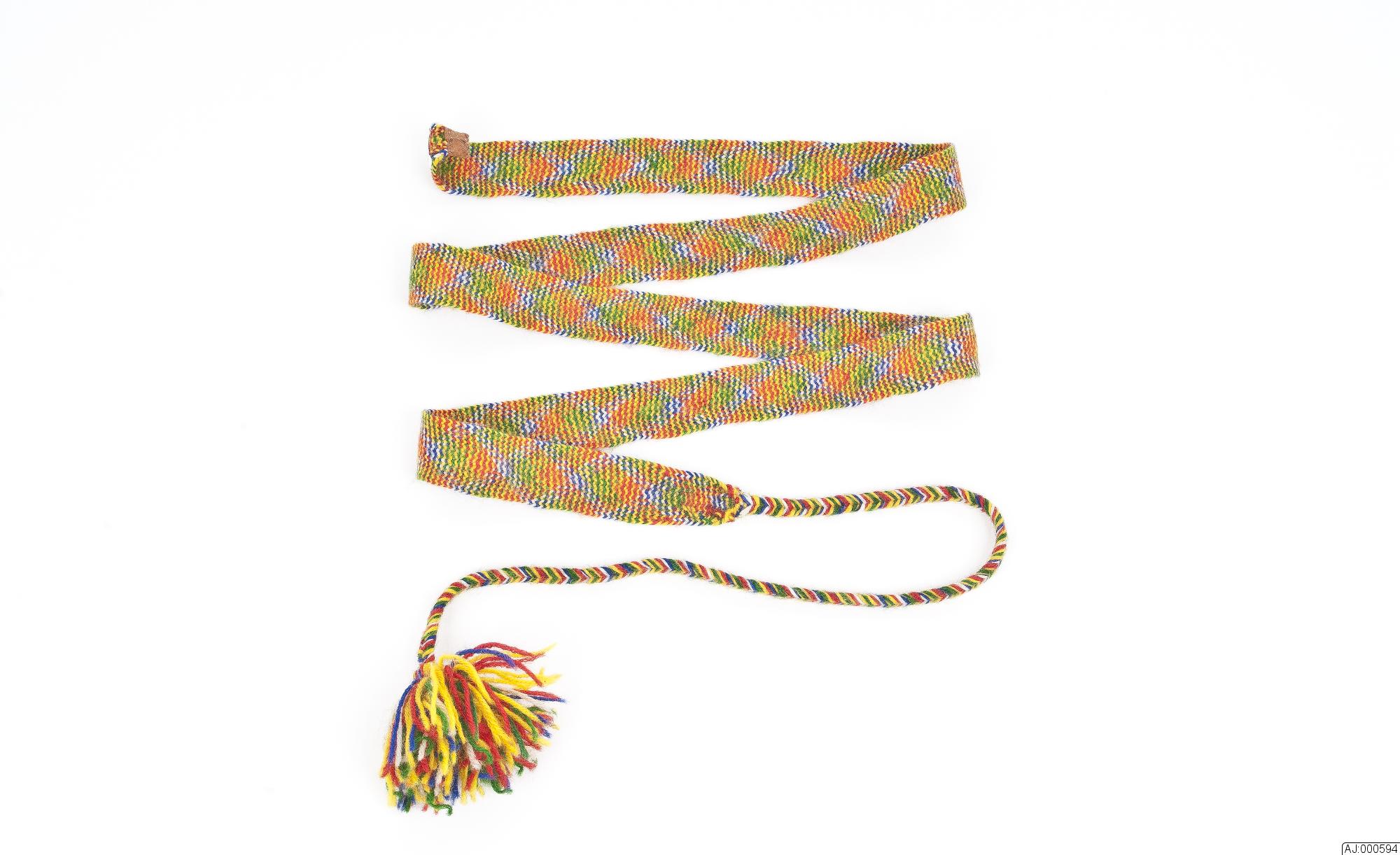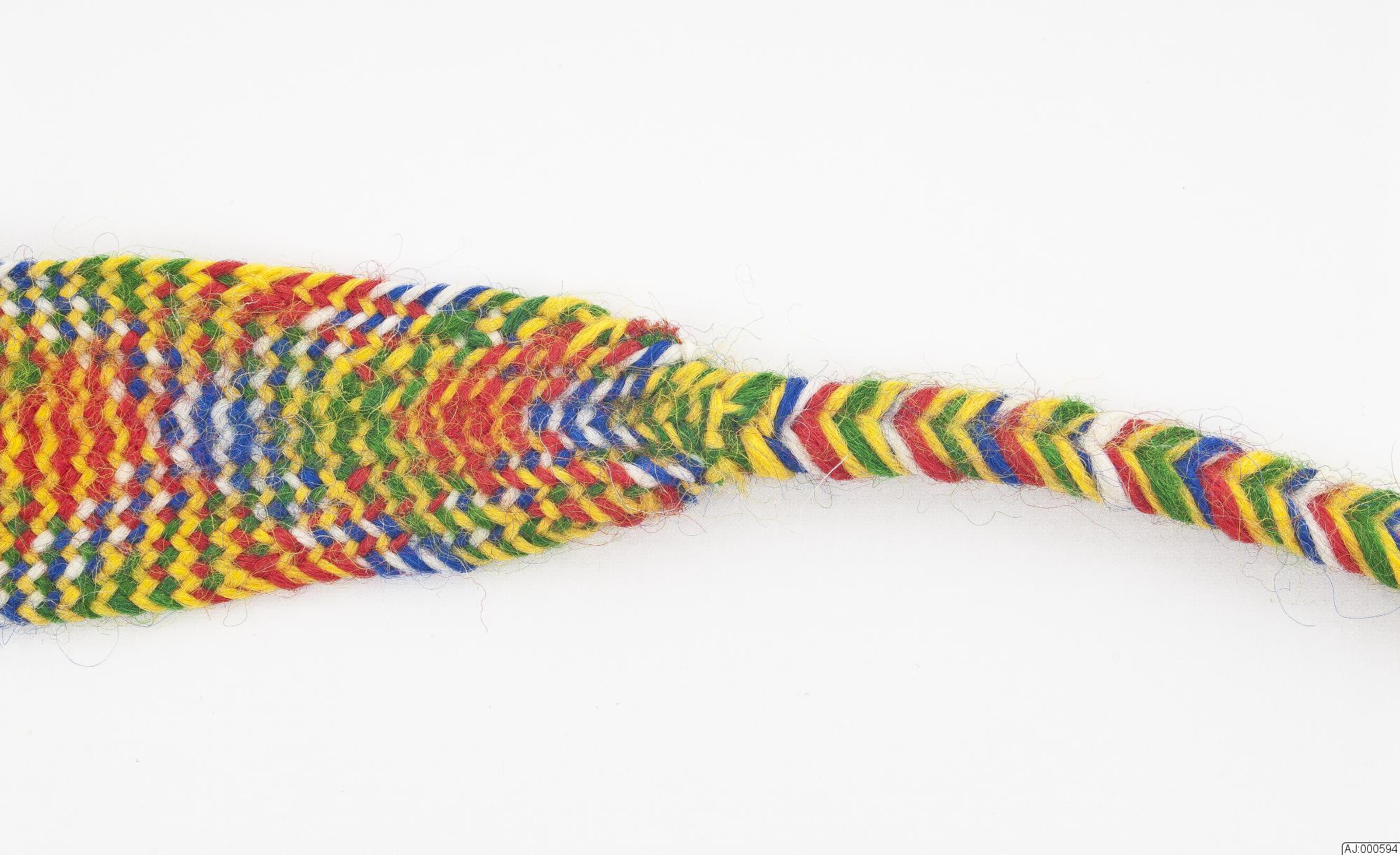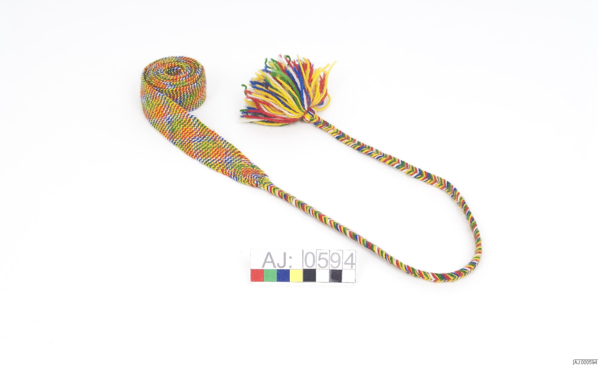 Ett par lagda mansskoband från Arjeplog. Sådana här mansskoband kallas för snjierága och är vävda i färgerna rött, blått, grönt, gult och vitt garn. Bandets längd är 137 cm. Den flätade delens längd är 49 cm. Snörremmen är fästad vid bandänden med skinn, i vilken en knapp är isydd. Den knappförsedda snörremmen fästes i skoöglan. Garnet till skobanden bör vara av fin kvalitet och alltid med insla...