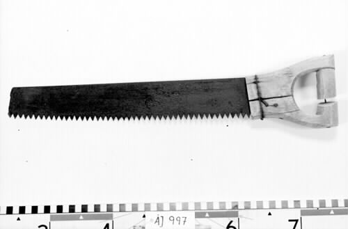 Såg med stålblad och trähandtag. Bladet har ganska stora tänder och är något avsmalnande mot änden. Blad och handtag är sammanfogade med spik och en ögla av järn.