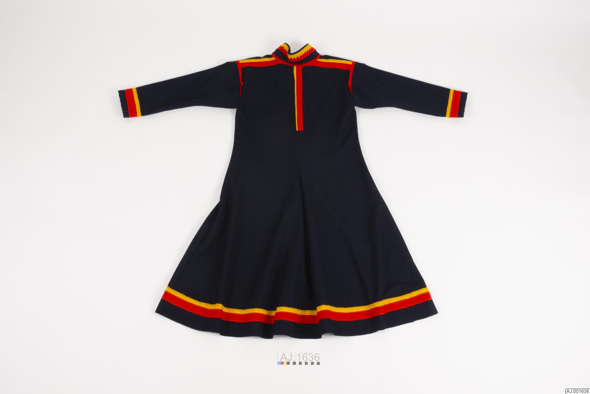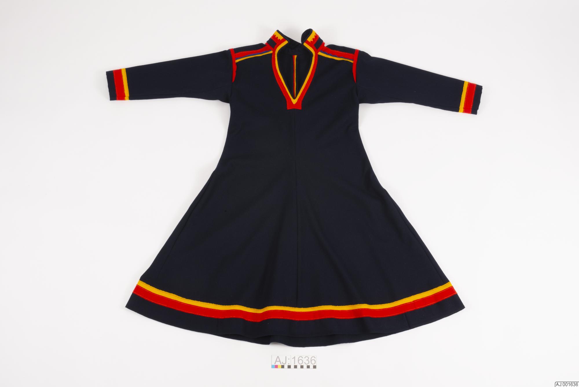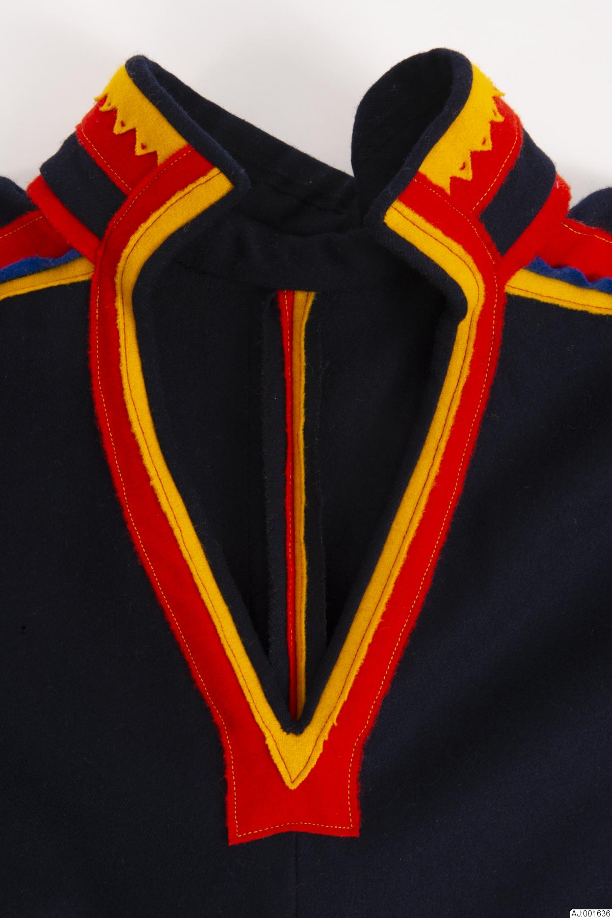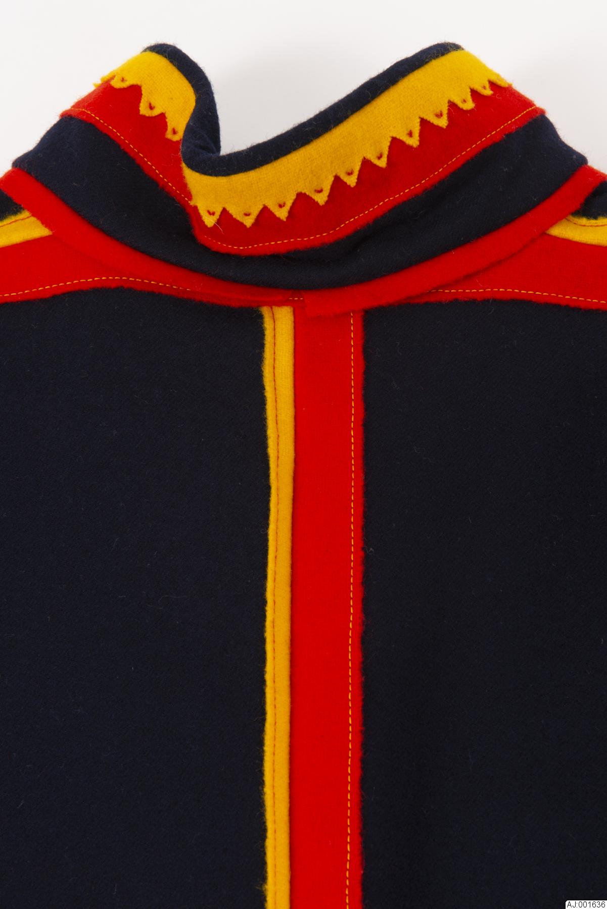 Kolt sydd av svart yllegabardin. Delad fram- och baksida. Ryggsömmen rött och gult kläde. Krage av kolttyg med klädesdekoration av rött och gult. Det gula är uddklippt, sydd med handsöm. Gult, blått och rött kläde i axelsöm. Gult och rött i ärmlinning och fåll. Kolten är sydd som Gällivare äldre modell, av Inger Sjaunja under studietiden vid Sameslöjdlinjen, Samernas Folkhögskola, Jokkmokk.