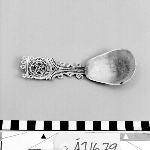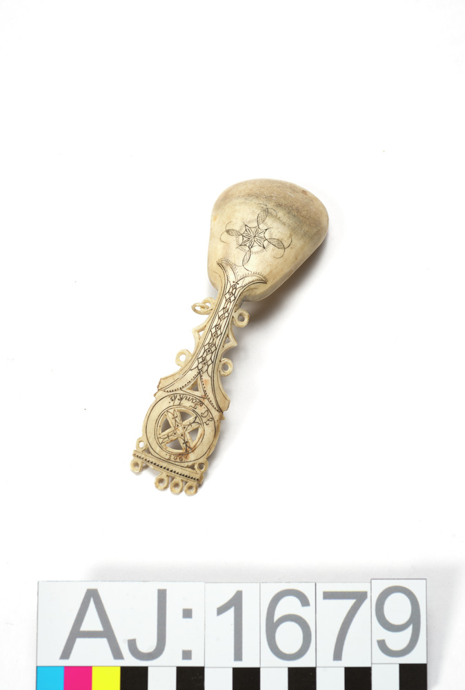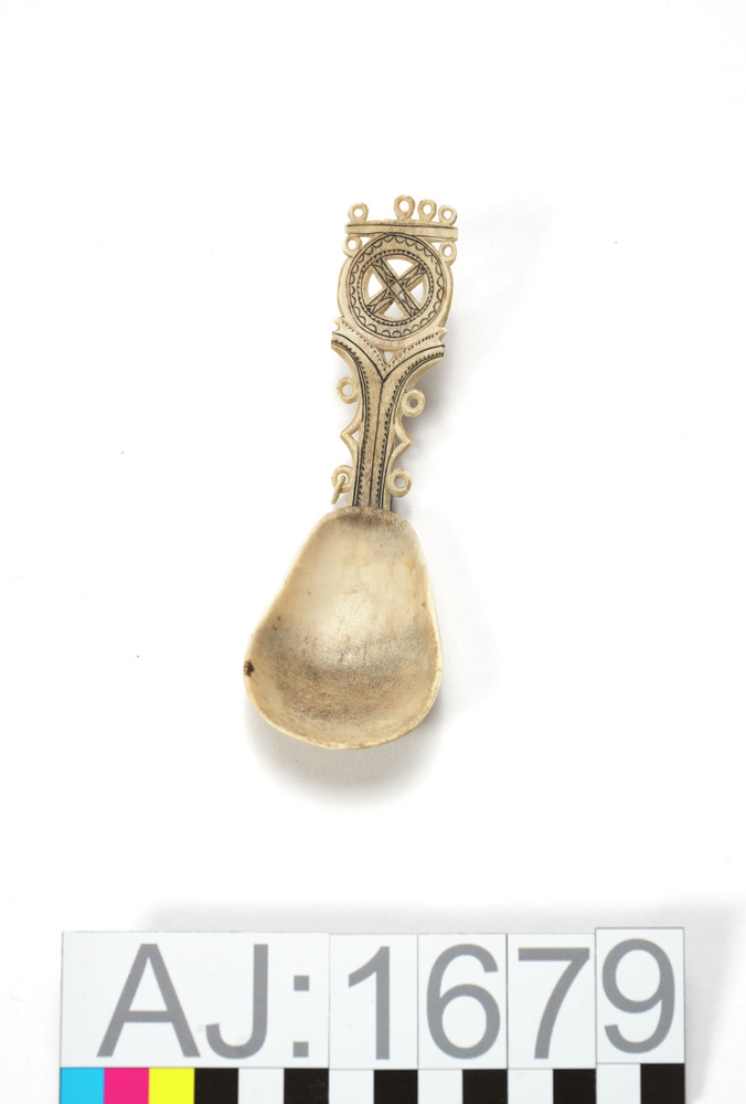 Sked gjord av renhorn. Skaftet är utsirat och graverat. På baksidan av skaftet är det graverat 1908, J.P. Fankki. Hornet är mörknat, en ring på skaftet är avbruten. Längre ner på skaftet har det troligtvis varit 4 ringar, fastsatta. En ring är kvar. Se skiss.