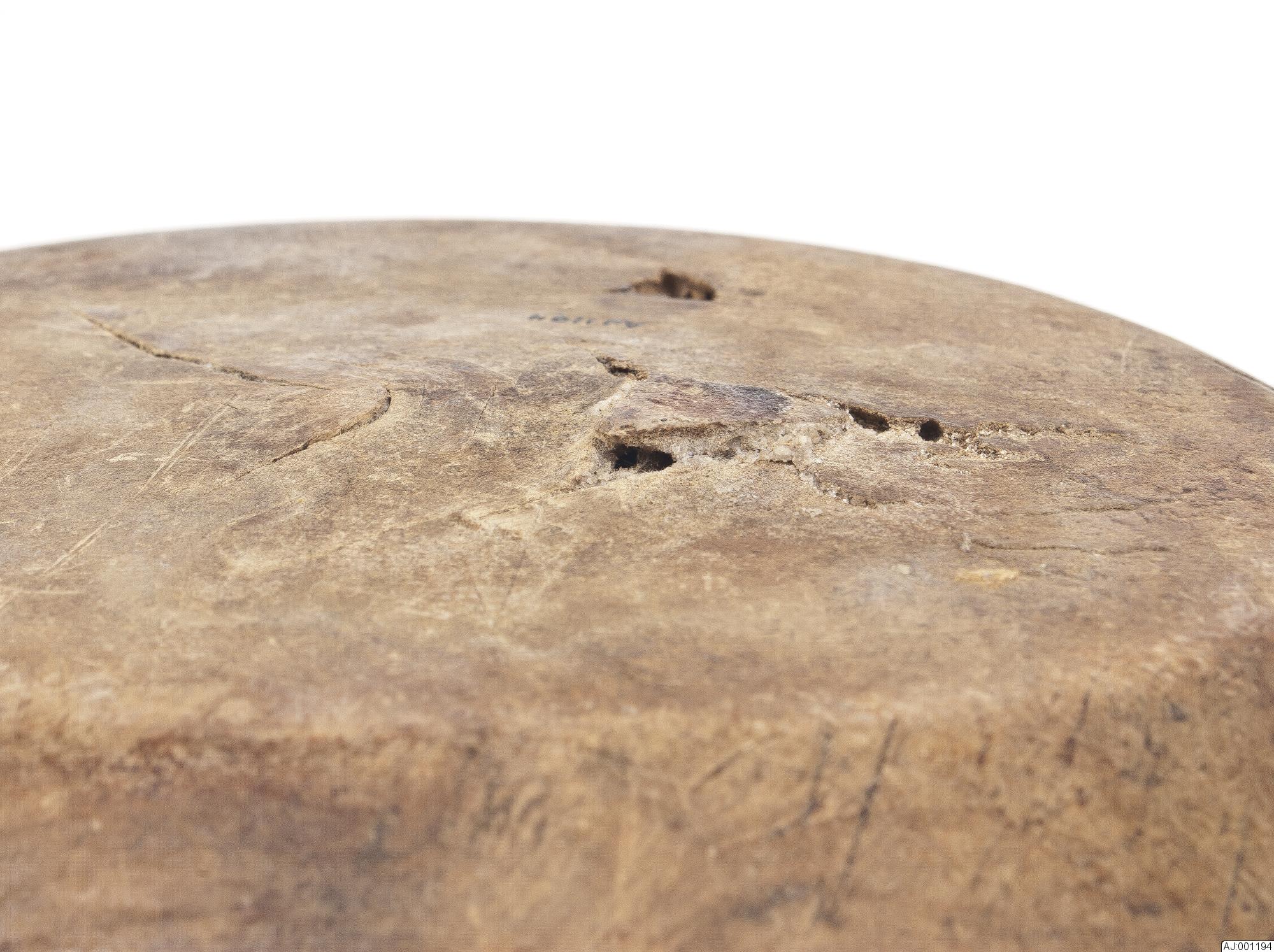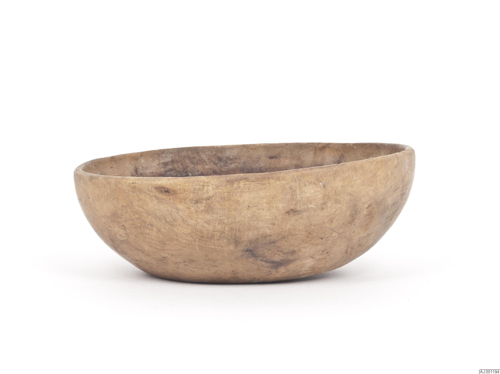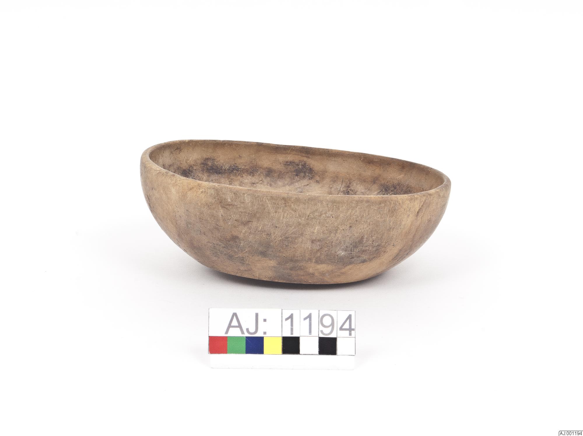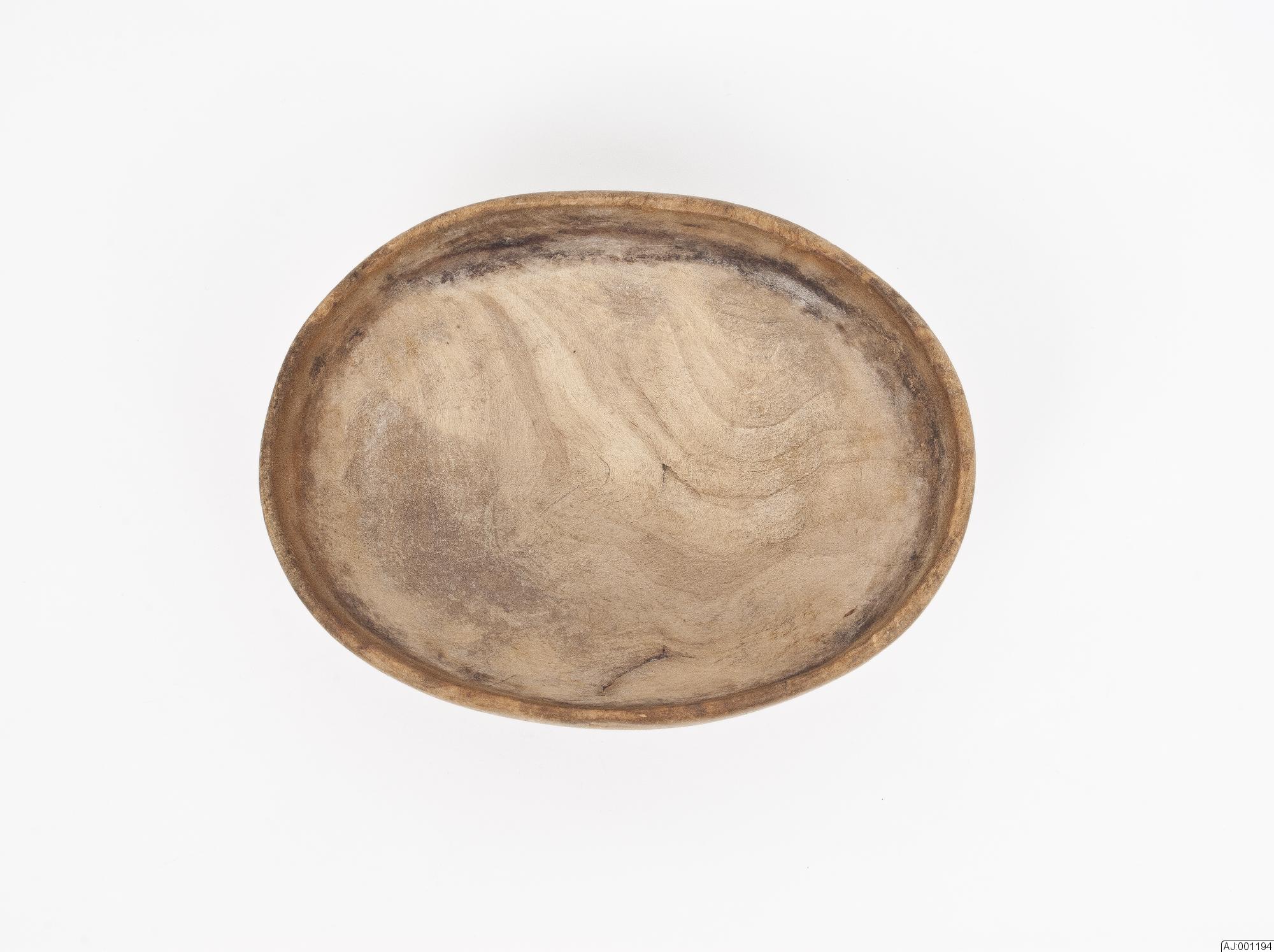 • Liten skål i trä, platt botten. Den är lite trasig, sprucken.